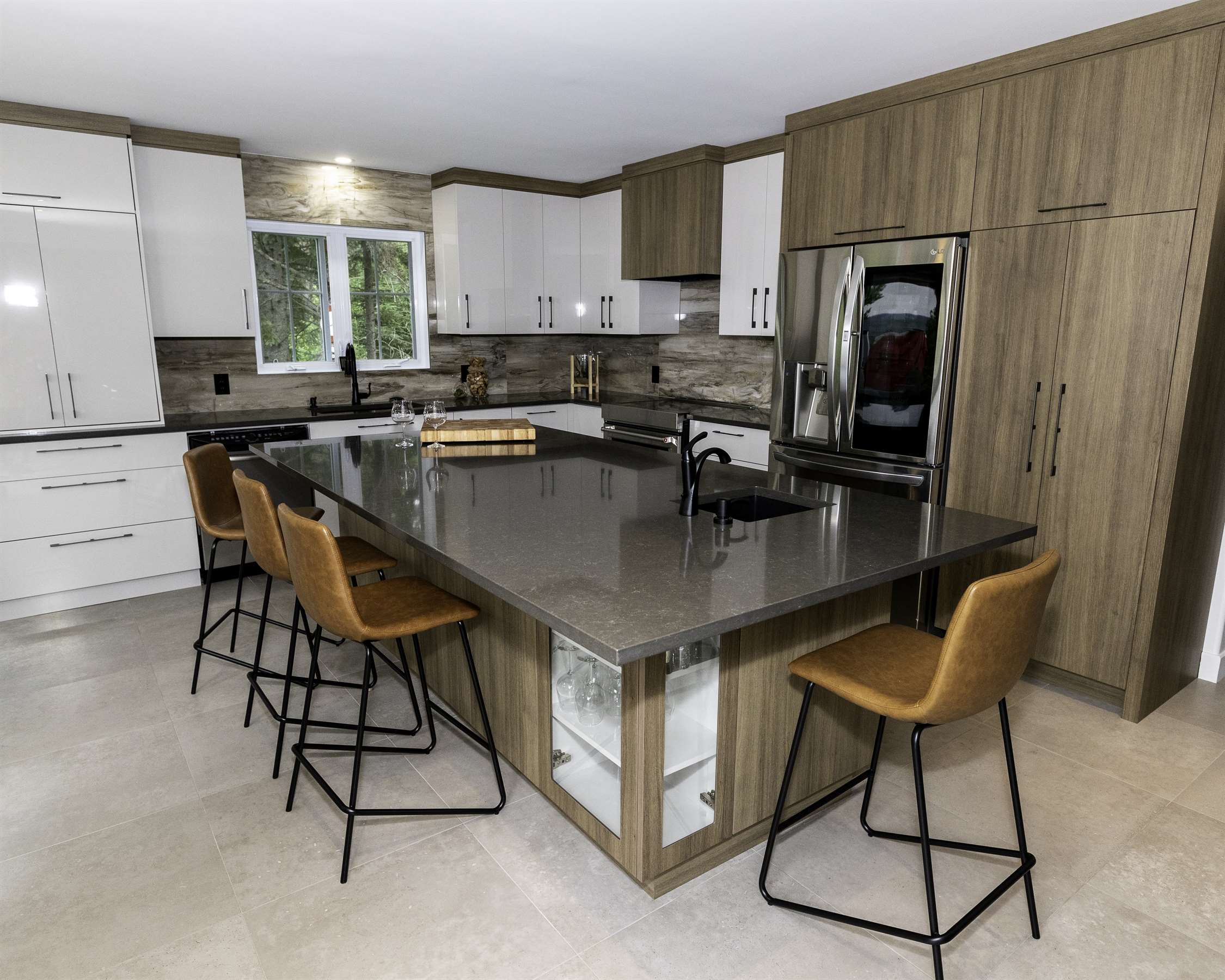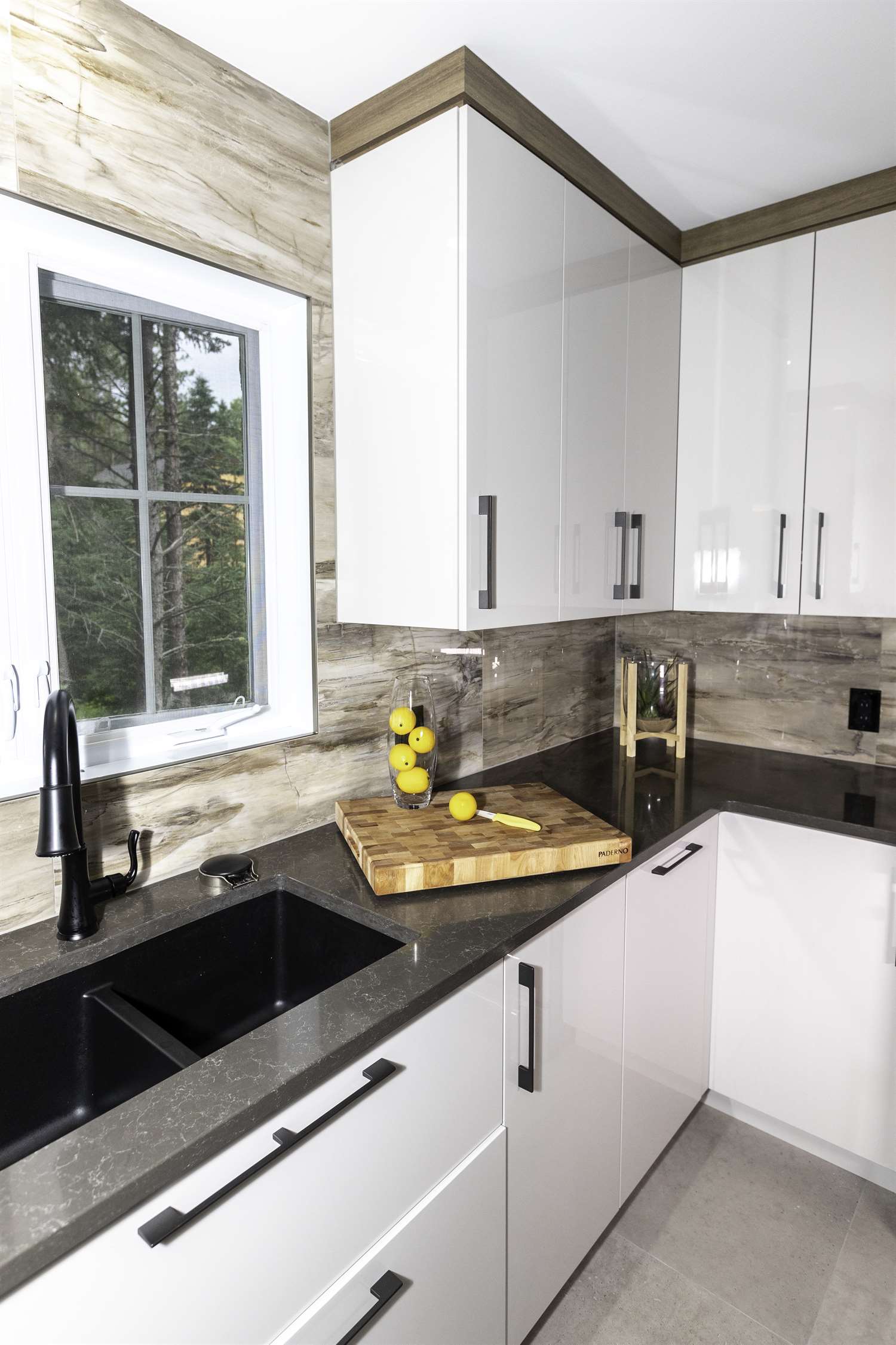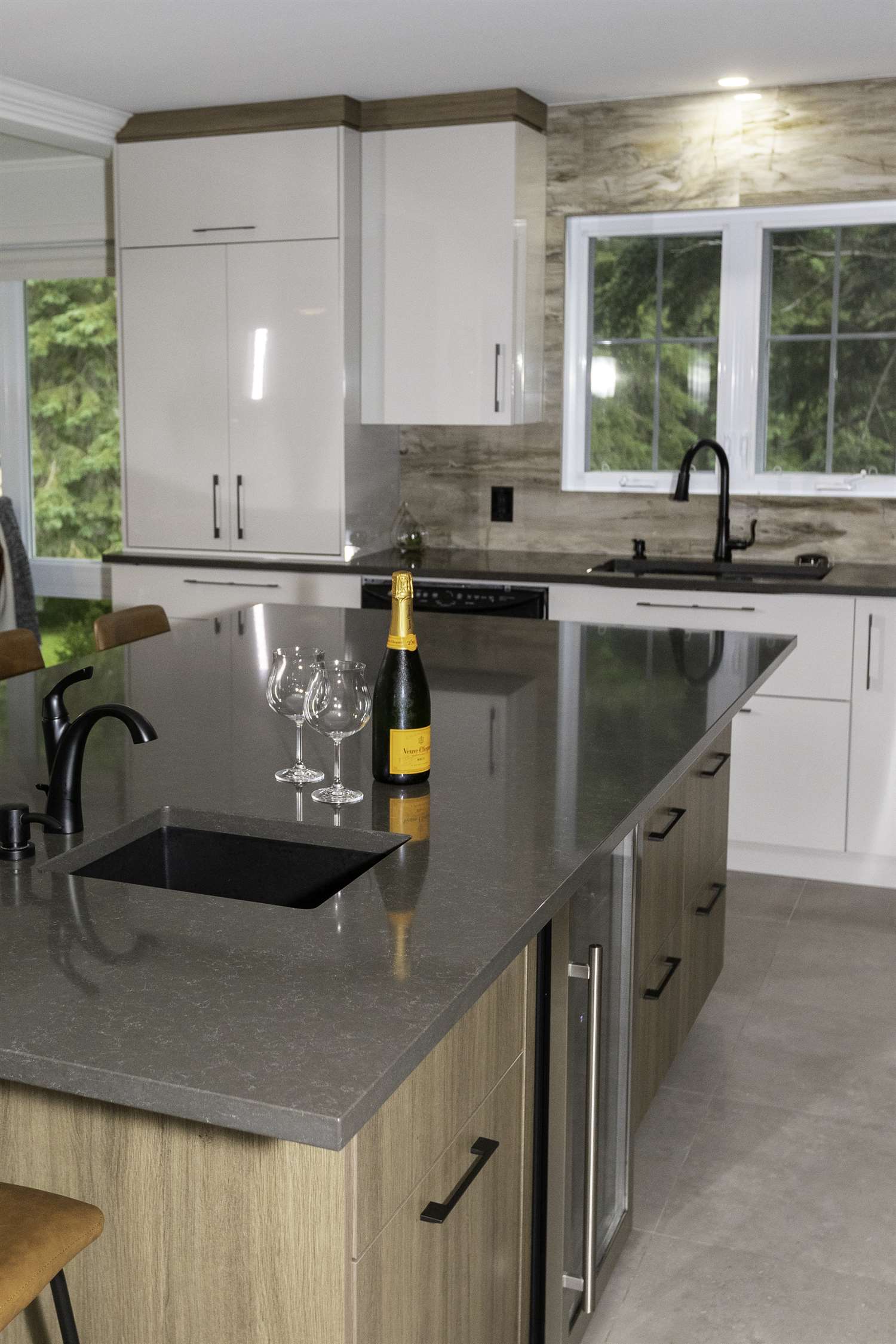 Cette nouvelle cuisine a été entièrement réorganisée pour optimiser l’espace et offrir un décor raffiné. Notre équipe a installé un dosseret au format 24×48, des armoires sur mesure et un comptoir de quartz, en plus d’intégrer une hotte Vent A Hood. Tous les matériaux ont été soigneusement sélectionnés dans notre boutique et l’installation complète des armoires et de la céramique a été réalisée par notre équipe.