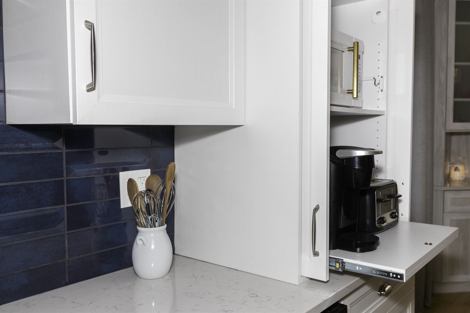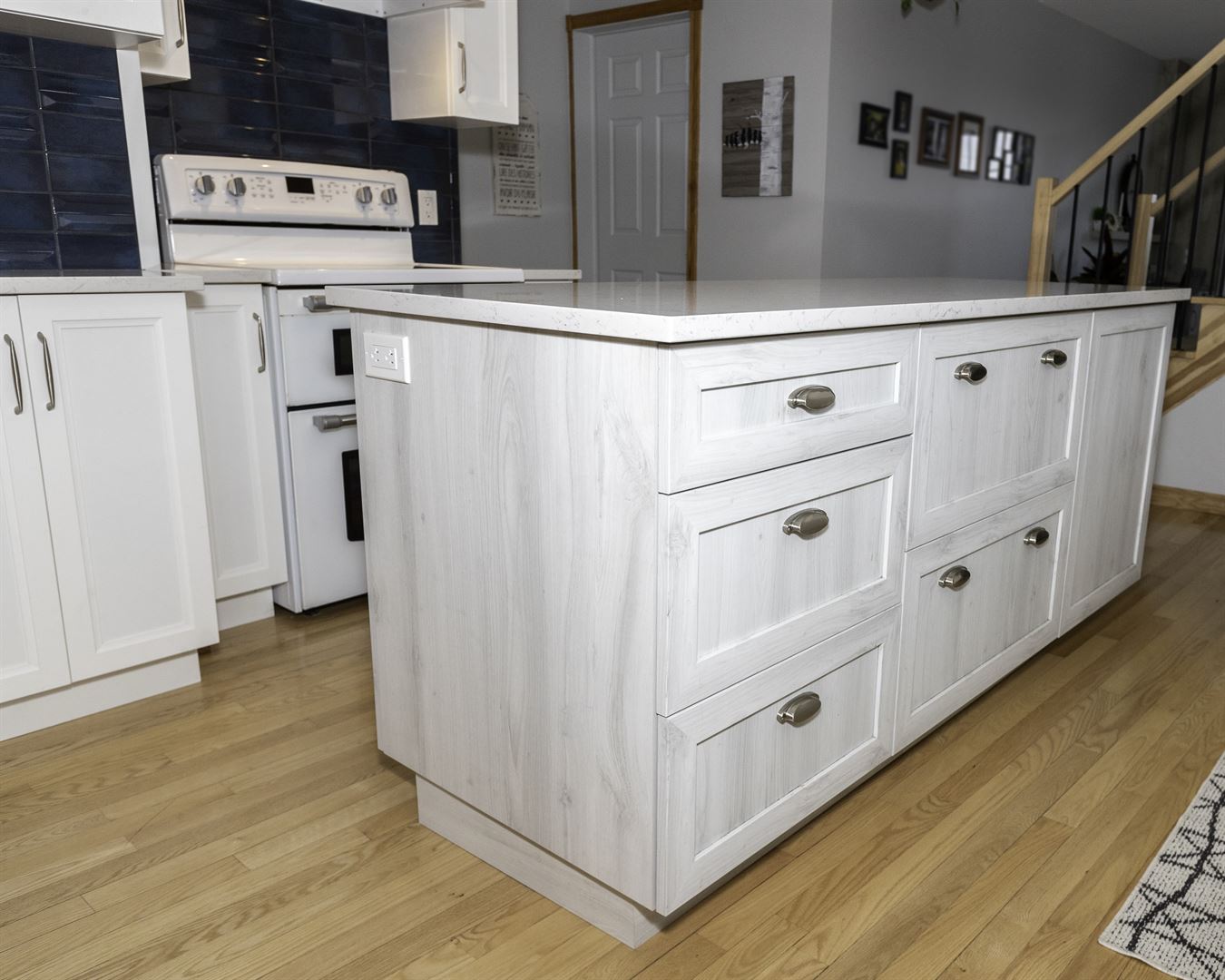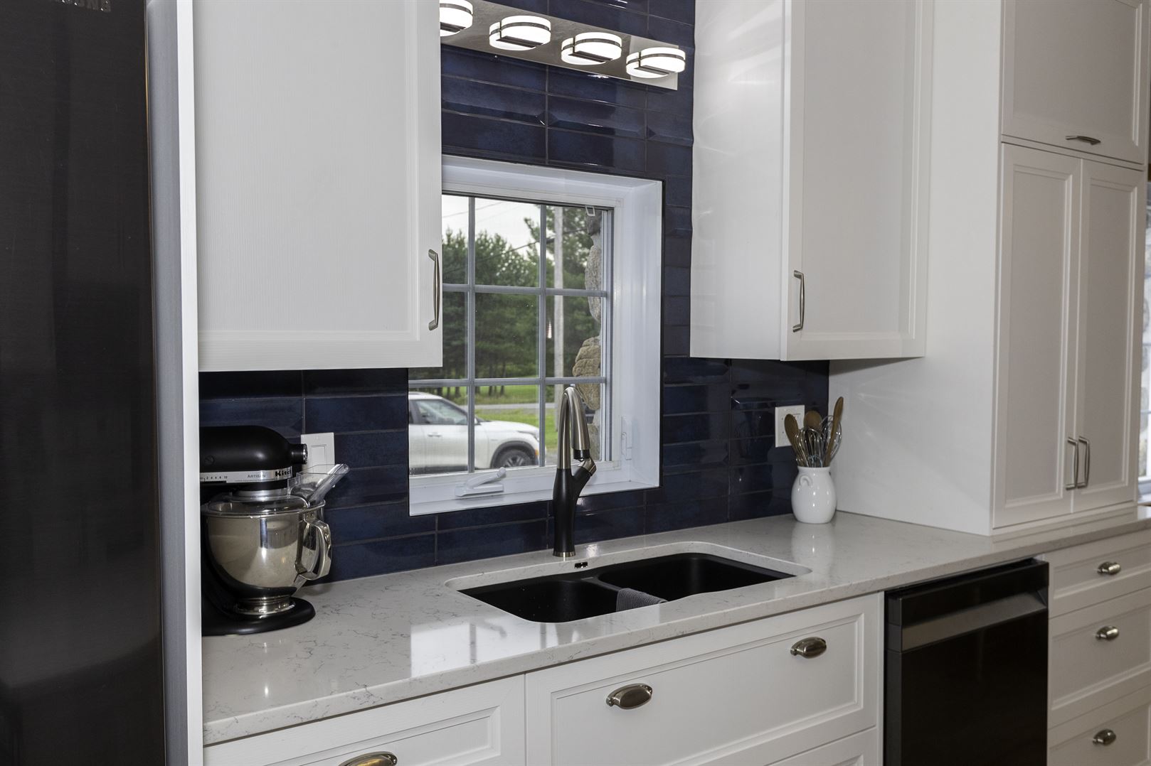 Dans ce projet, nous avons transformé la cuisine tout en respectant l’âme de la maison existante. Les armoires originales en bois ont été remplacées par des modèles élégants, complétés par une hotte au charbon Vent A Hood et un dosseret de cuisine spectaculaire.