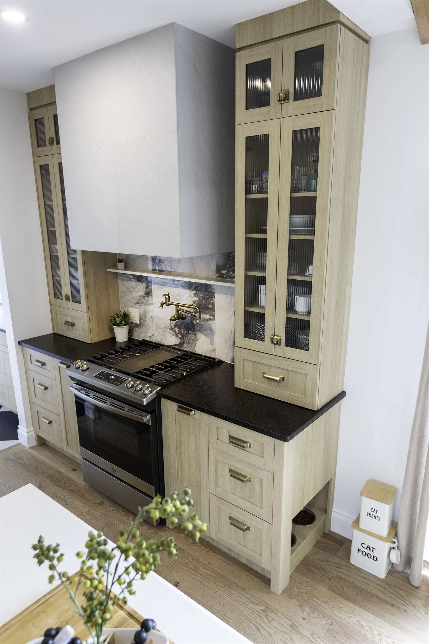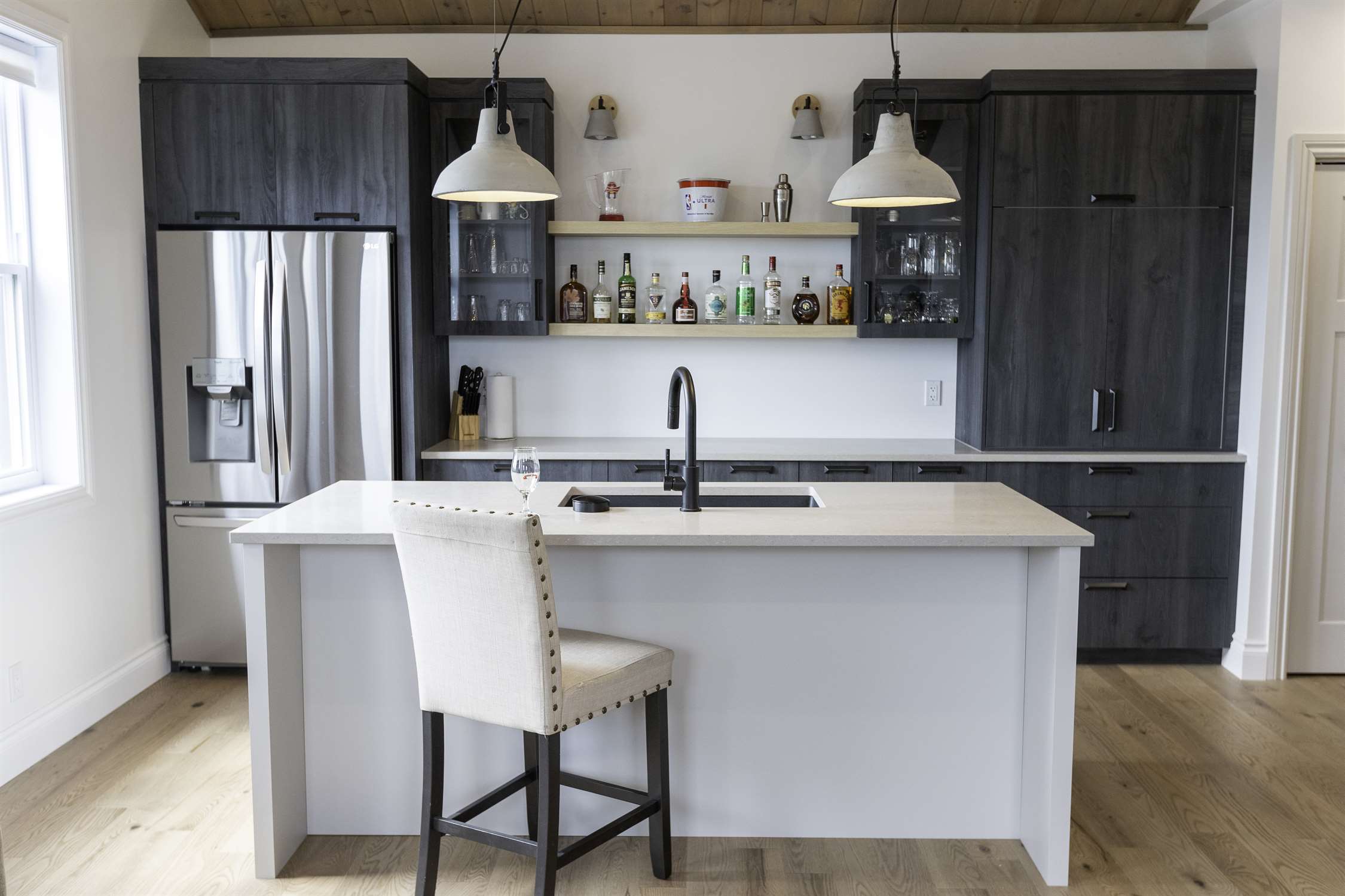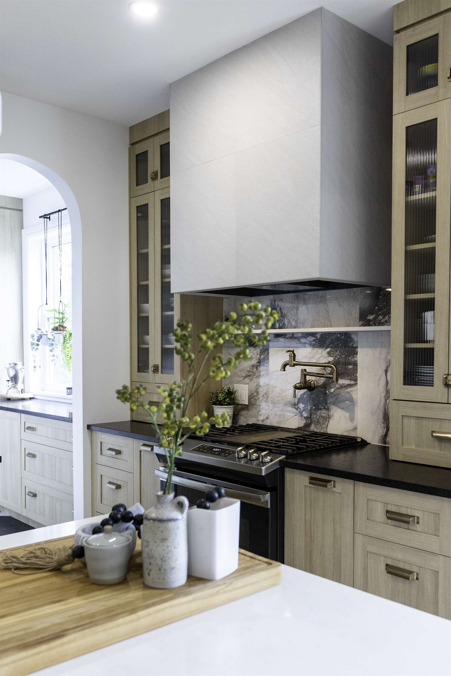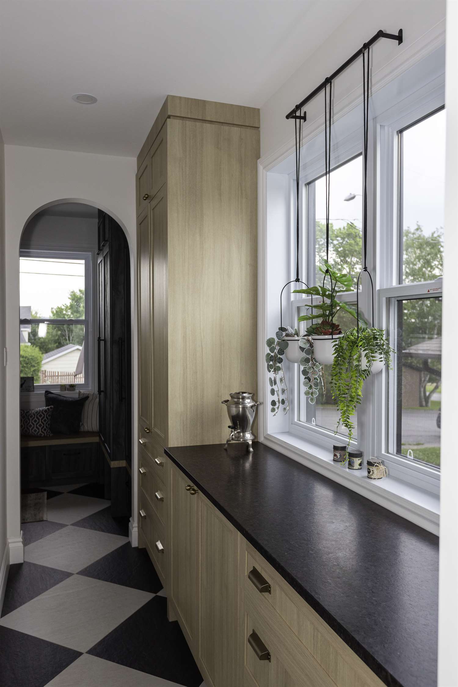 Nous avons aménagé le mudroom, l’arrière-cuisine, la cuisine avec îlot central, et installé hotte, vanité et céramique. Matériaux durables et comptoirs de quartz, tous sélectionnés dans notre boutique. Pose des armoires et céramique réalisée par notre équipe, pour un intérieur fonctionnel et élégant.