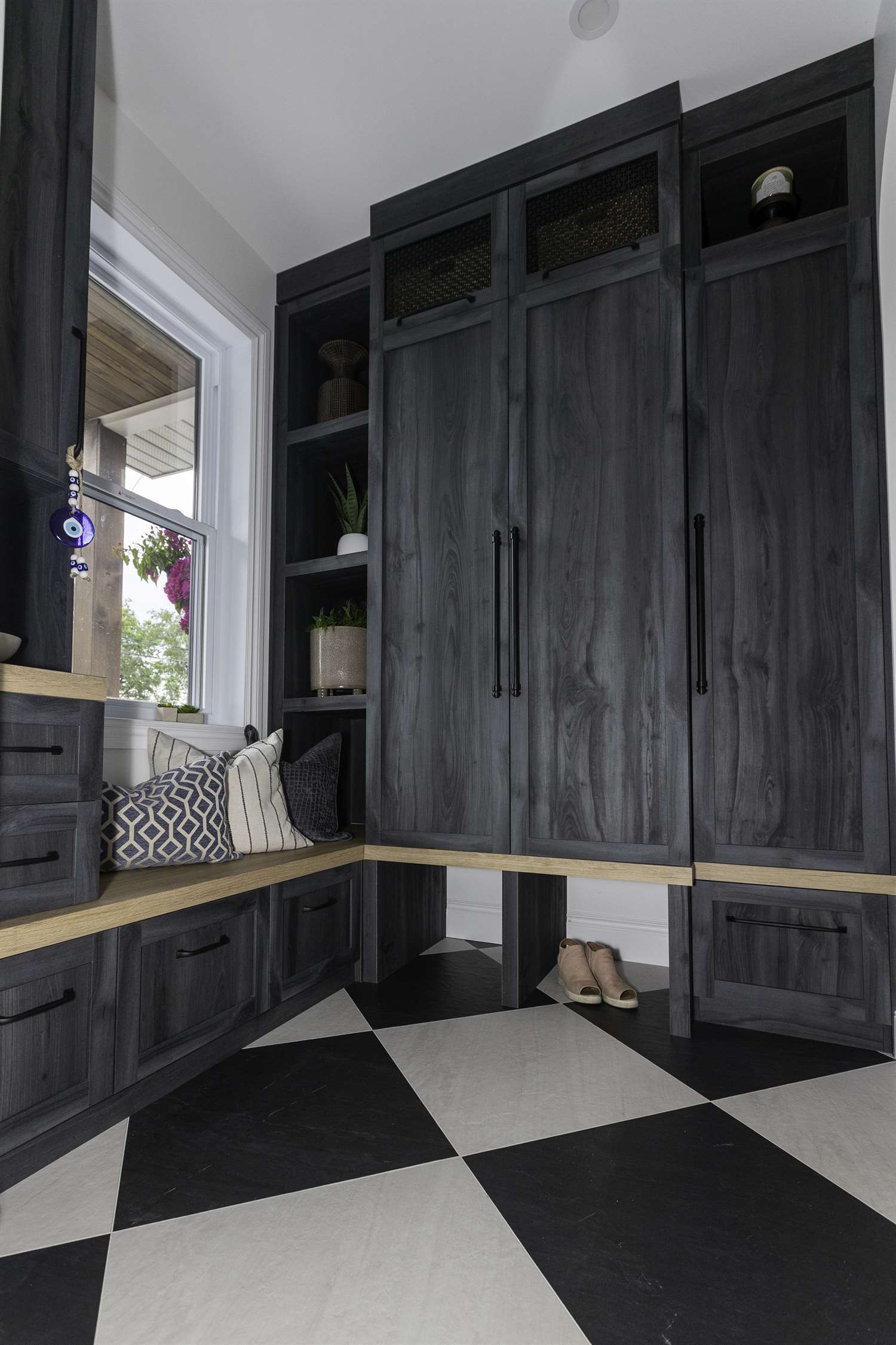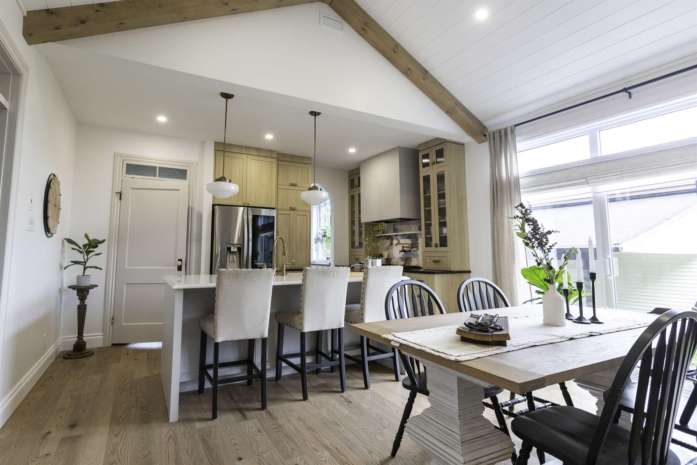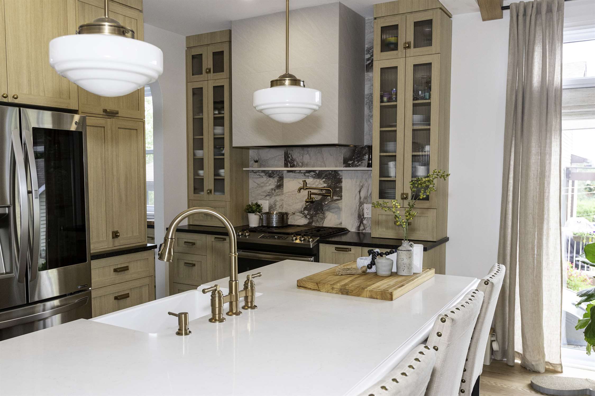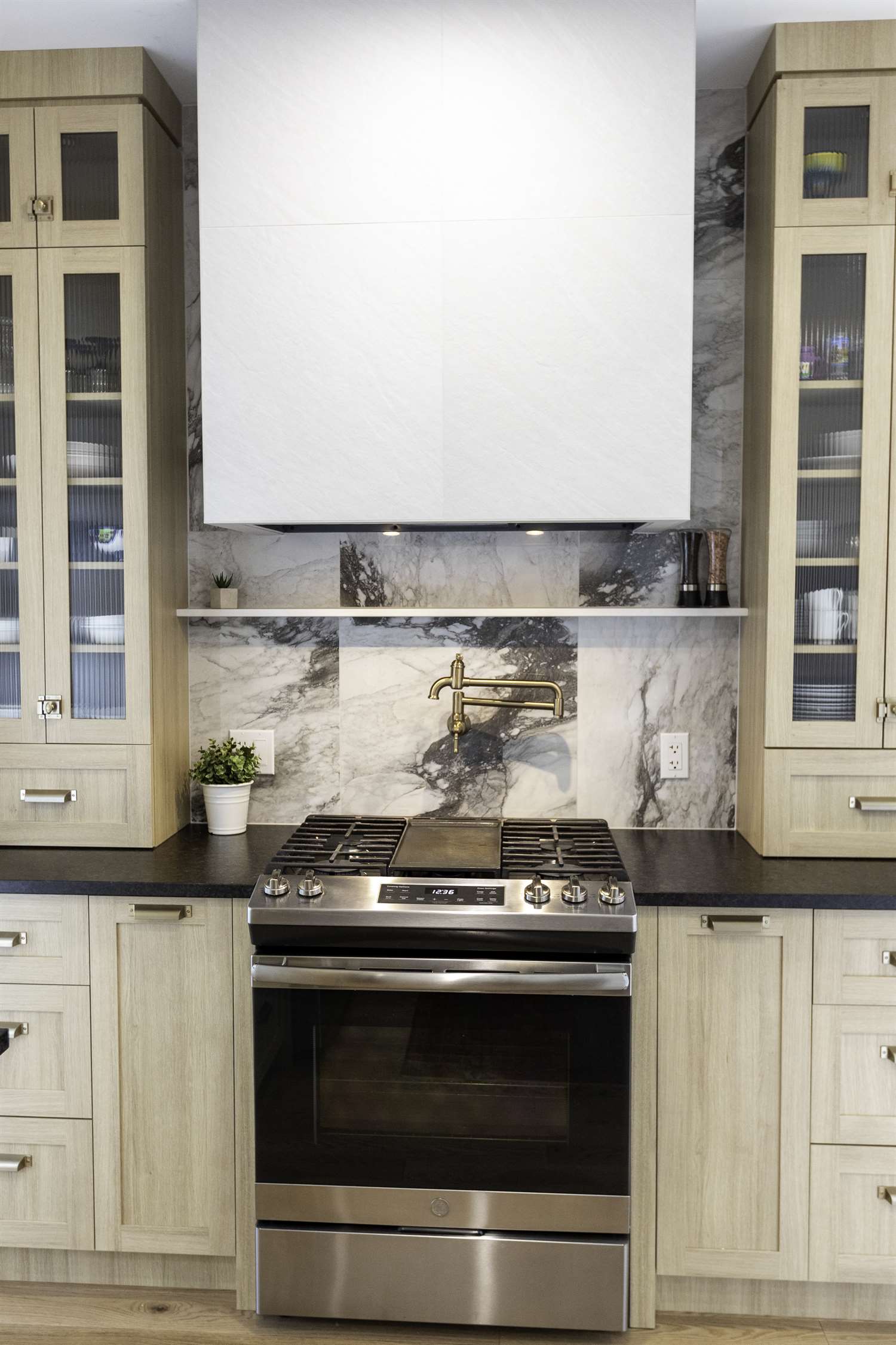 Nous avons aménagé le mudroom, l’arrière-cuisine, la cuisine avec îlot central, et installé hotte, vanité et céramique. Matériaux durables et comptoirs de quartz, tous sélectionnés dans notre boutique. Pose des armoires et céramique réalisée par notre équipe, pour un intérieur fonctionnel et élégant.