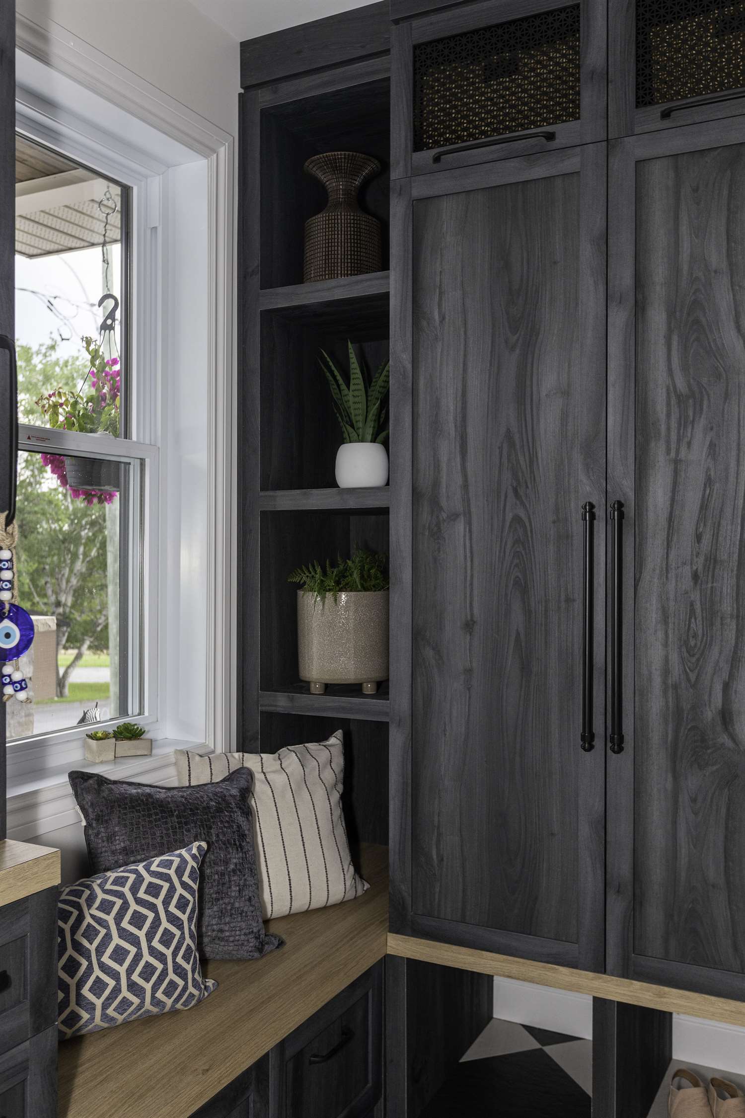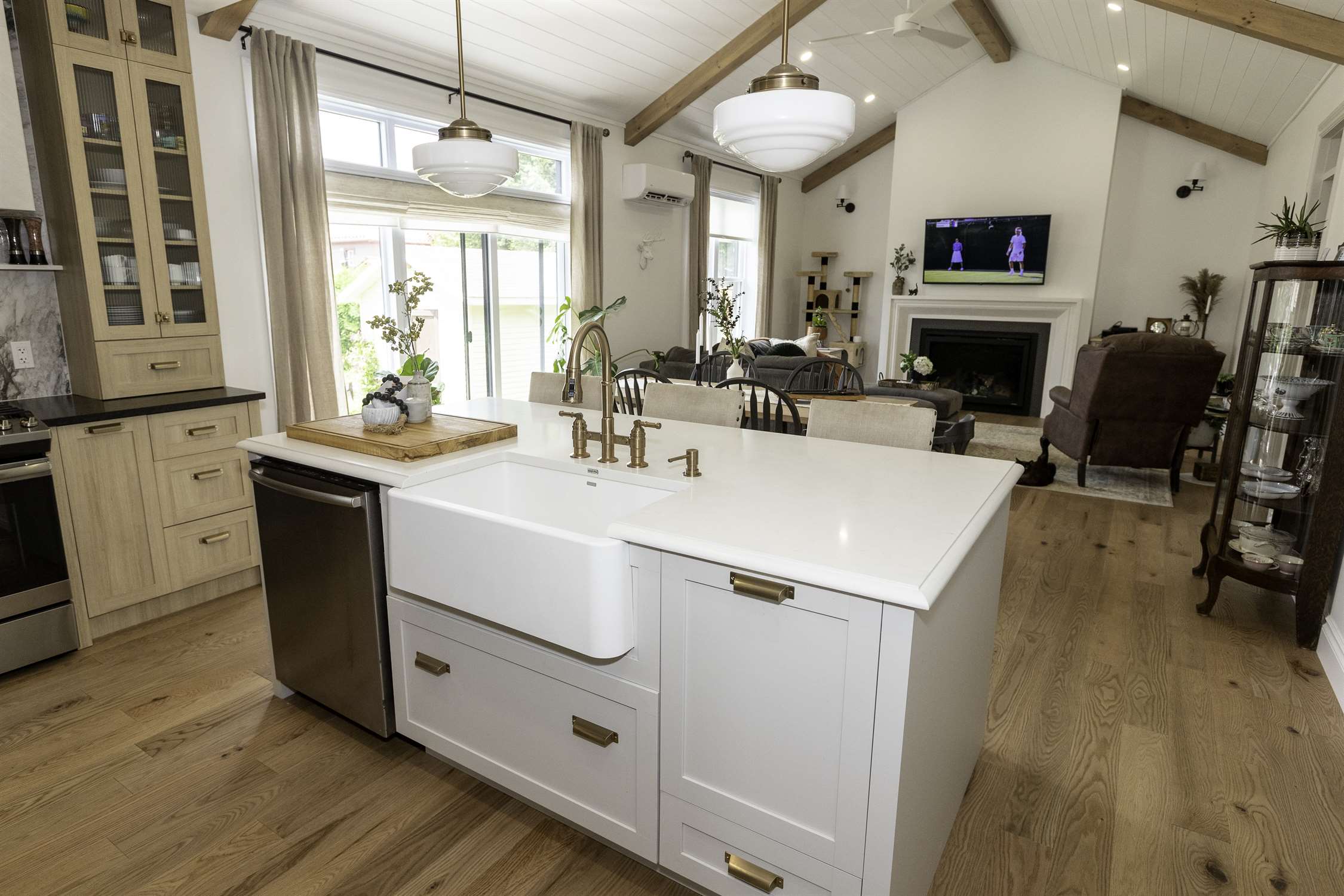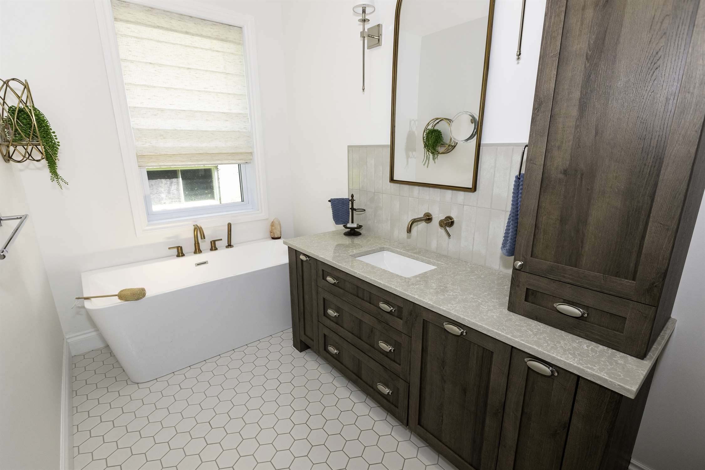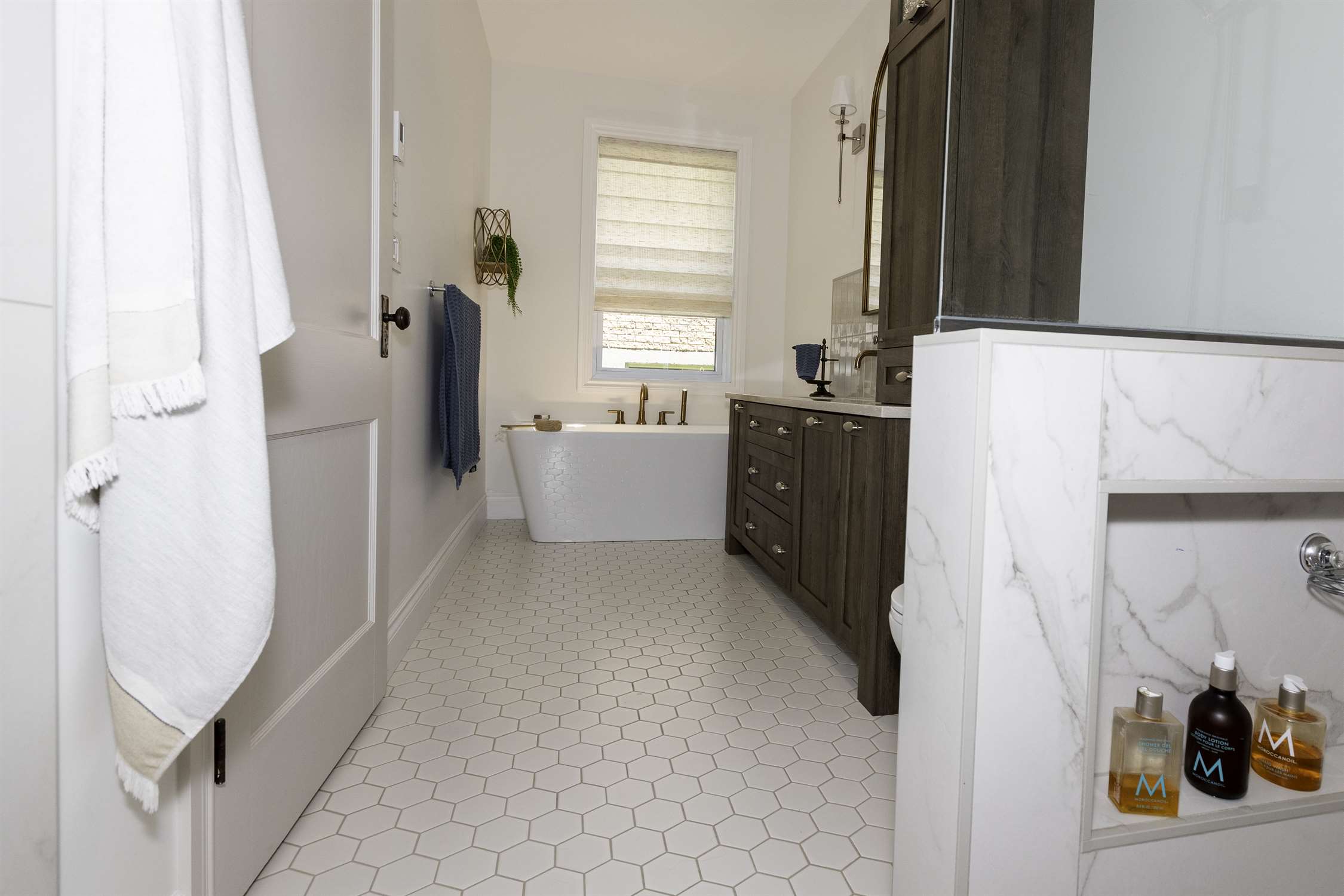 Nous avons aménagé le mudroom, l’arrière-cuisine, la cuisine avec îlot central, et installé hotte, vanité et céramique. Matériaux durables et comptoirs de quartz, tous sélectionnés dans notre boutique. Pose des armoires et céramique réalisée par notre équipe, pour un intérieur fonctionnel et élégant.