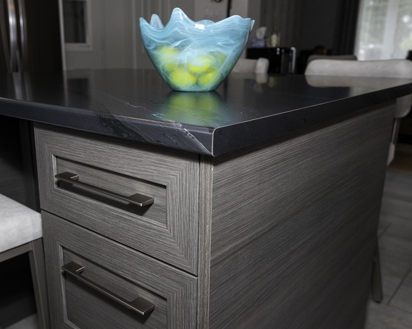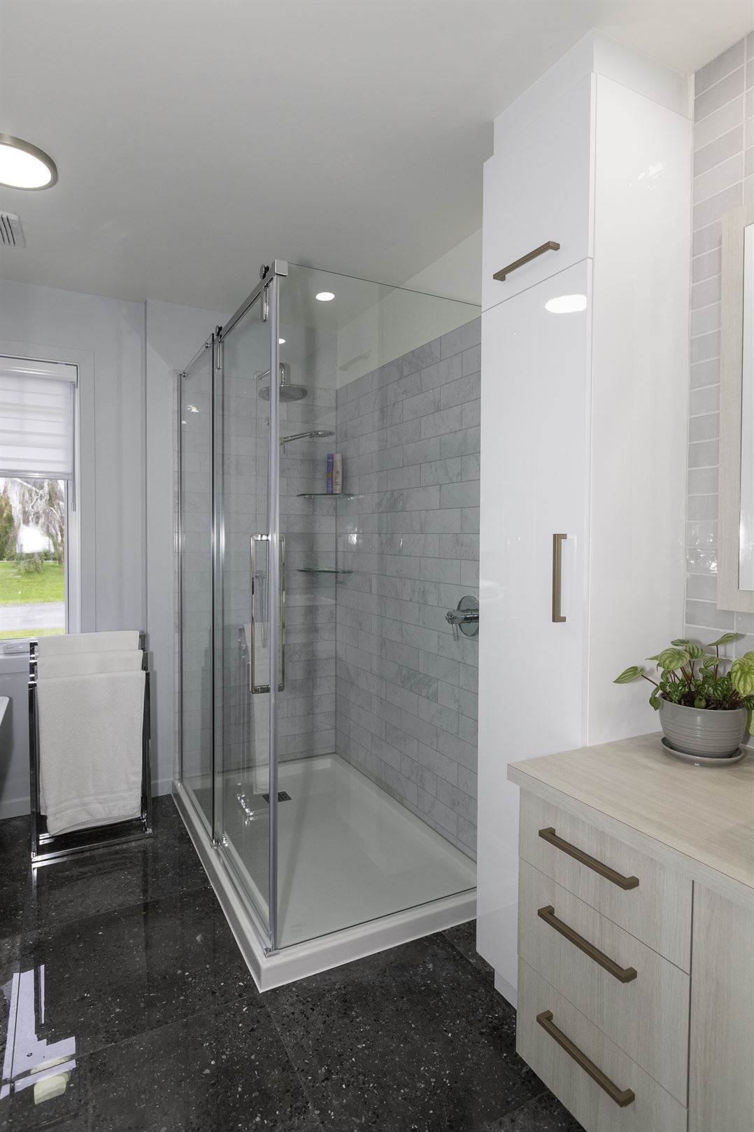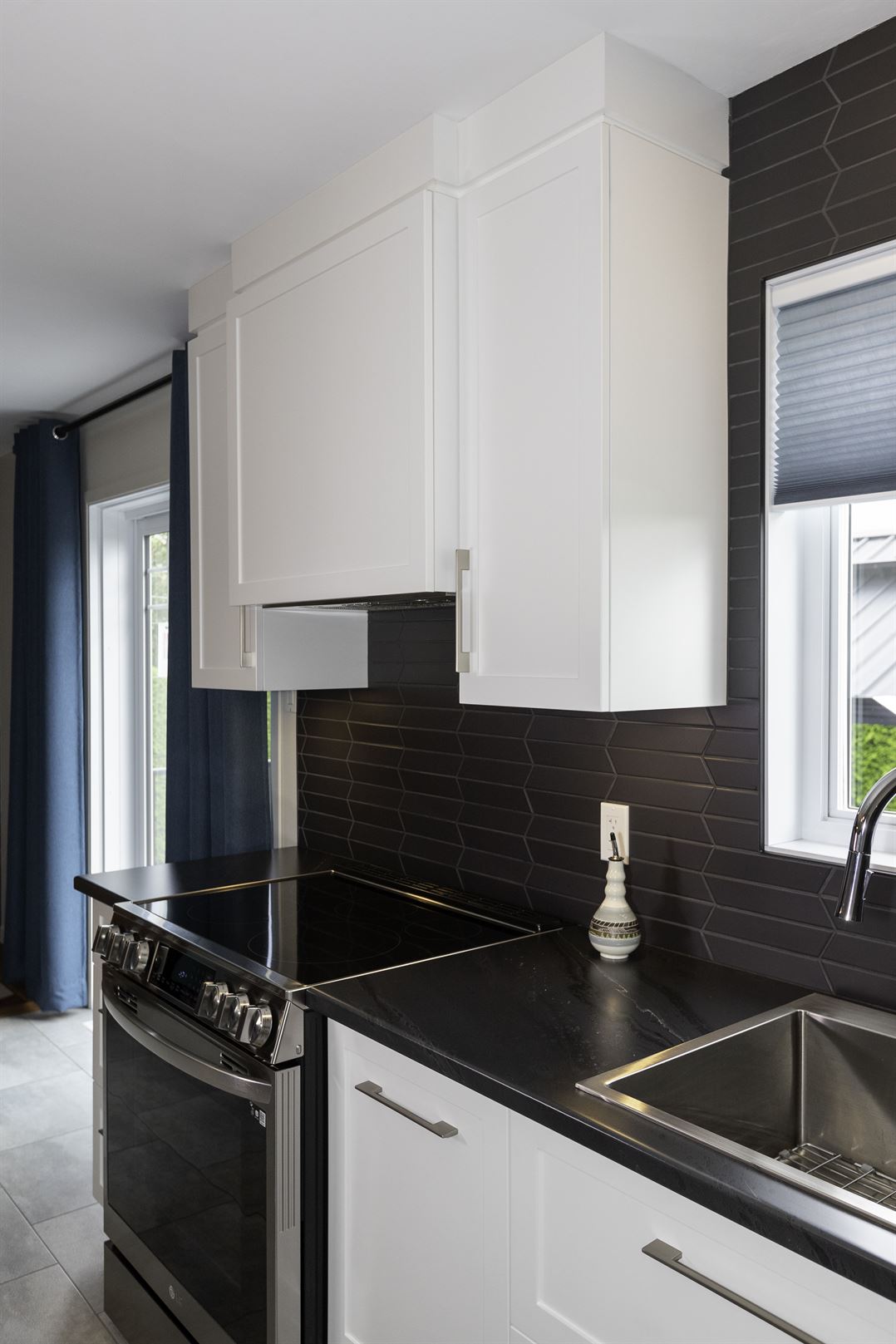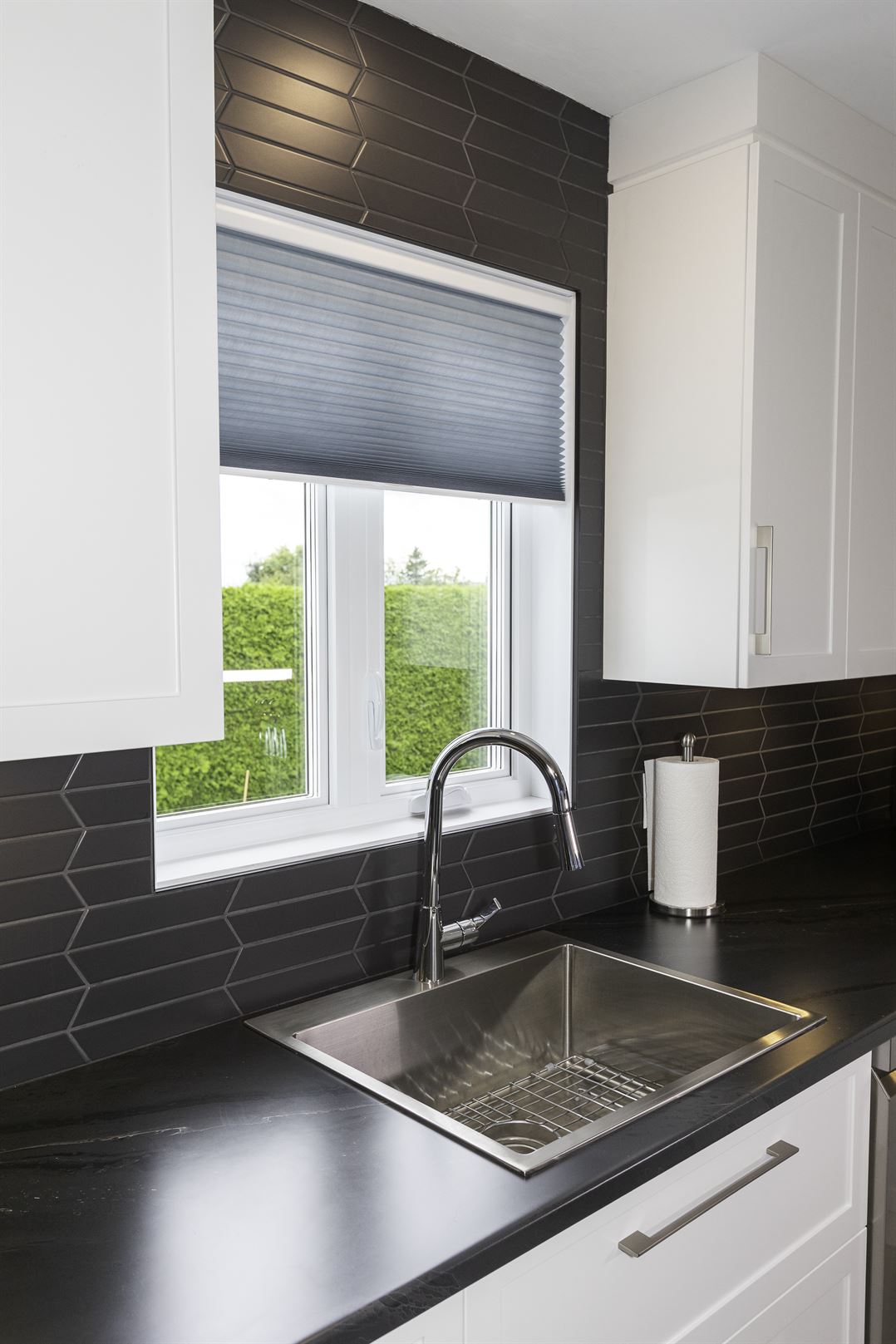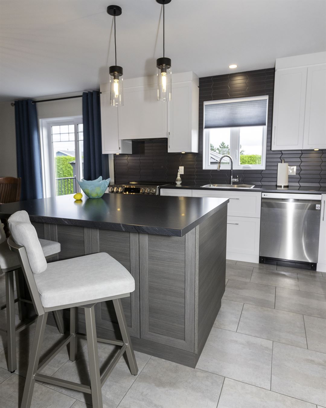 Îlot central avec place assise, dosseret moderne, toiles Hunter Douglas et agencement complet avec produits de notre boutique. Coin vanité et rangement laveuse-sécheuse séparé pour plus de confort. Une collaboration réussie avec un client impliqué a permis de respecter les échéanciers et d’obtenir un résultat harmonieux.
