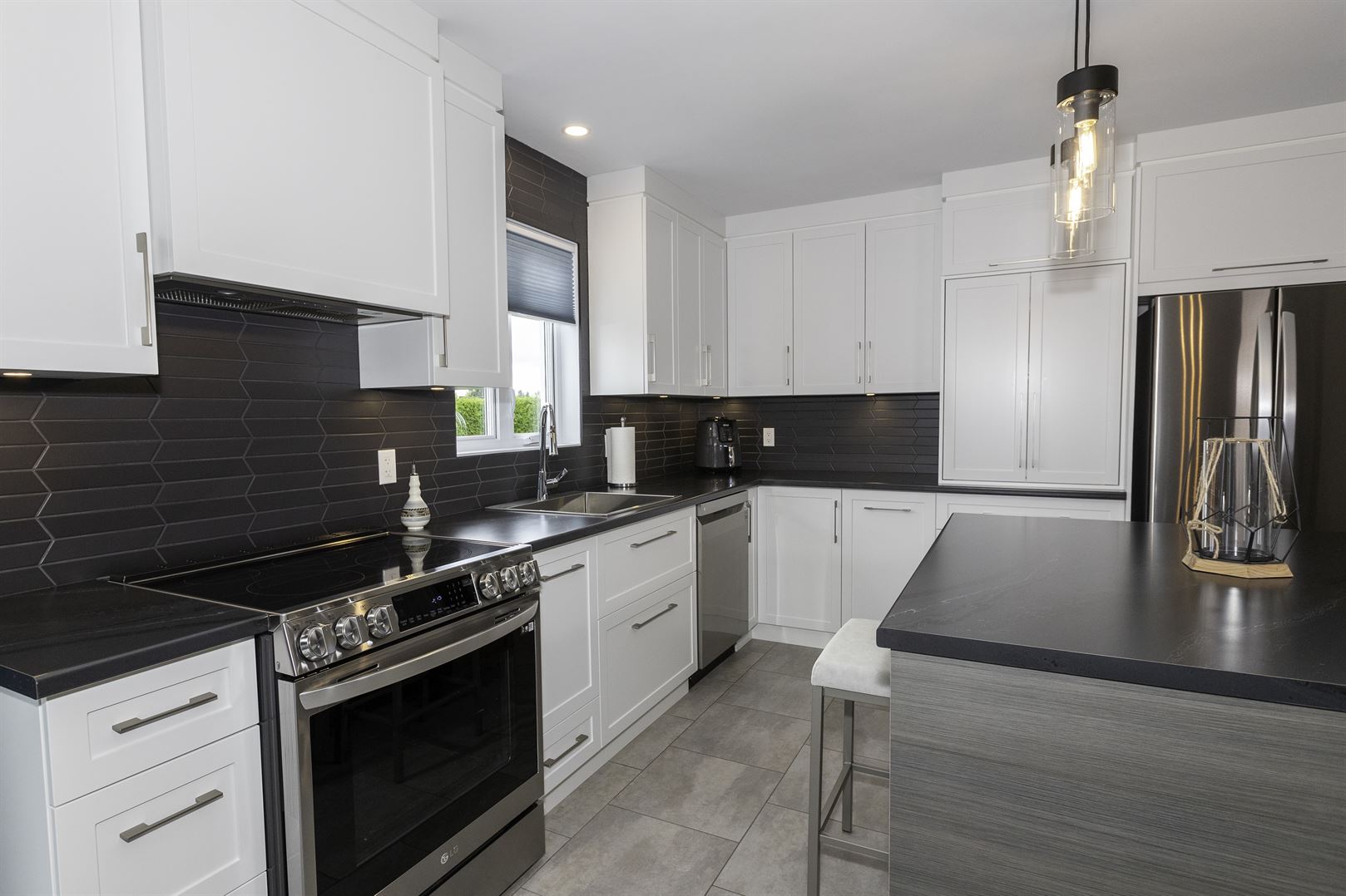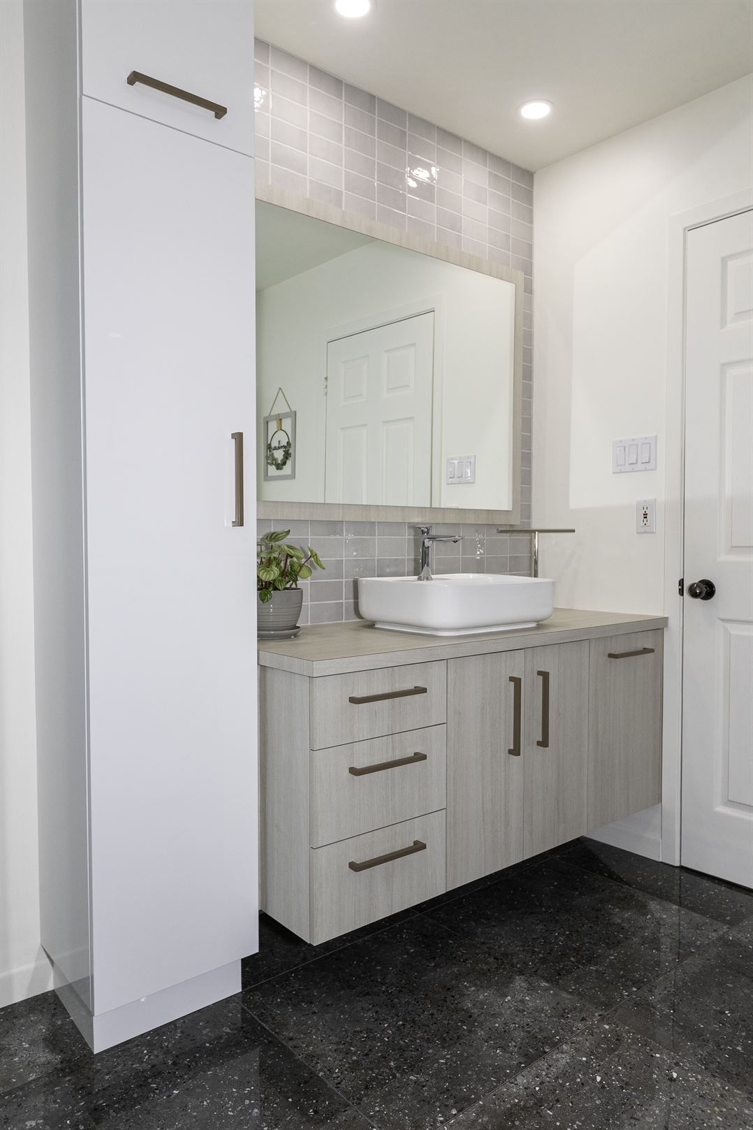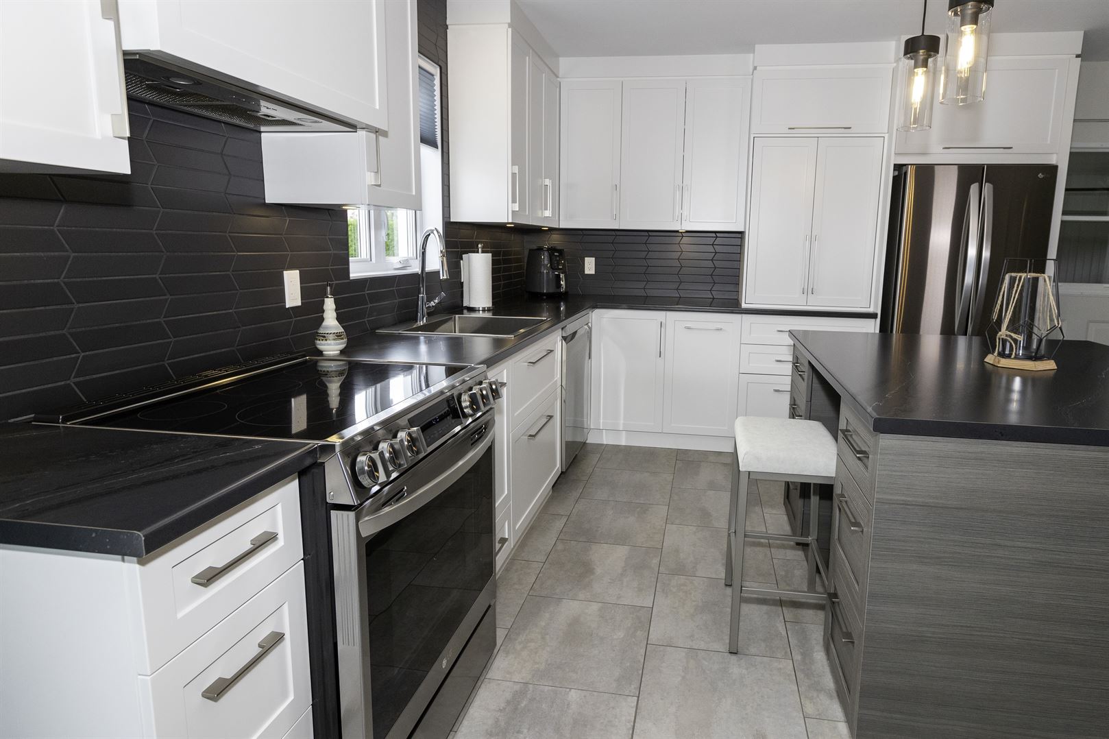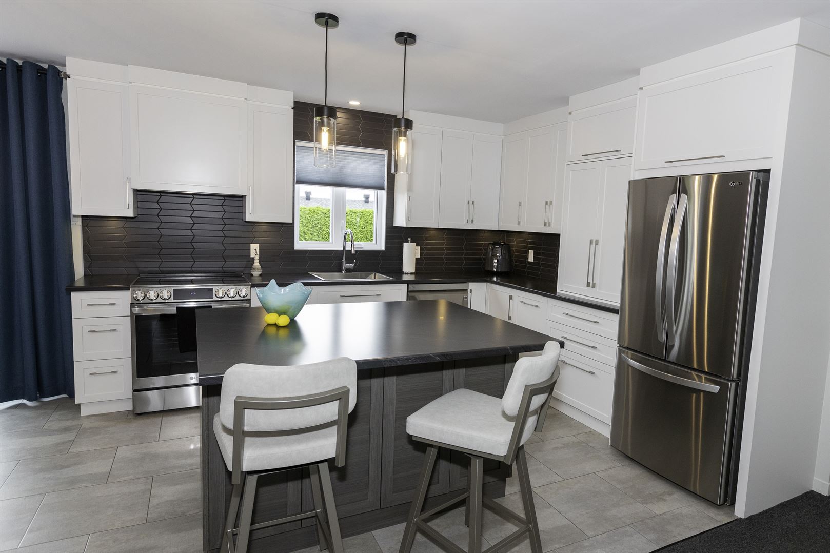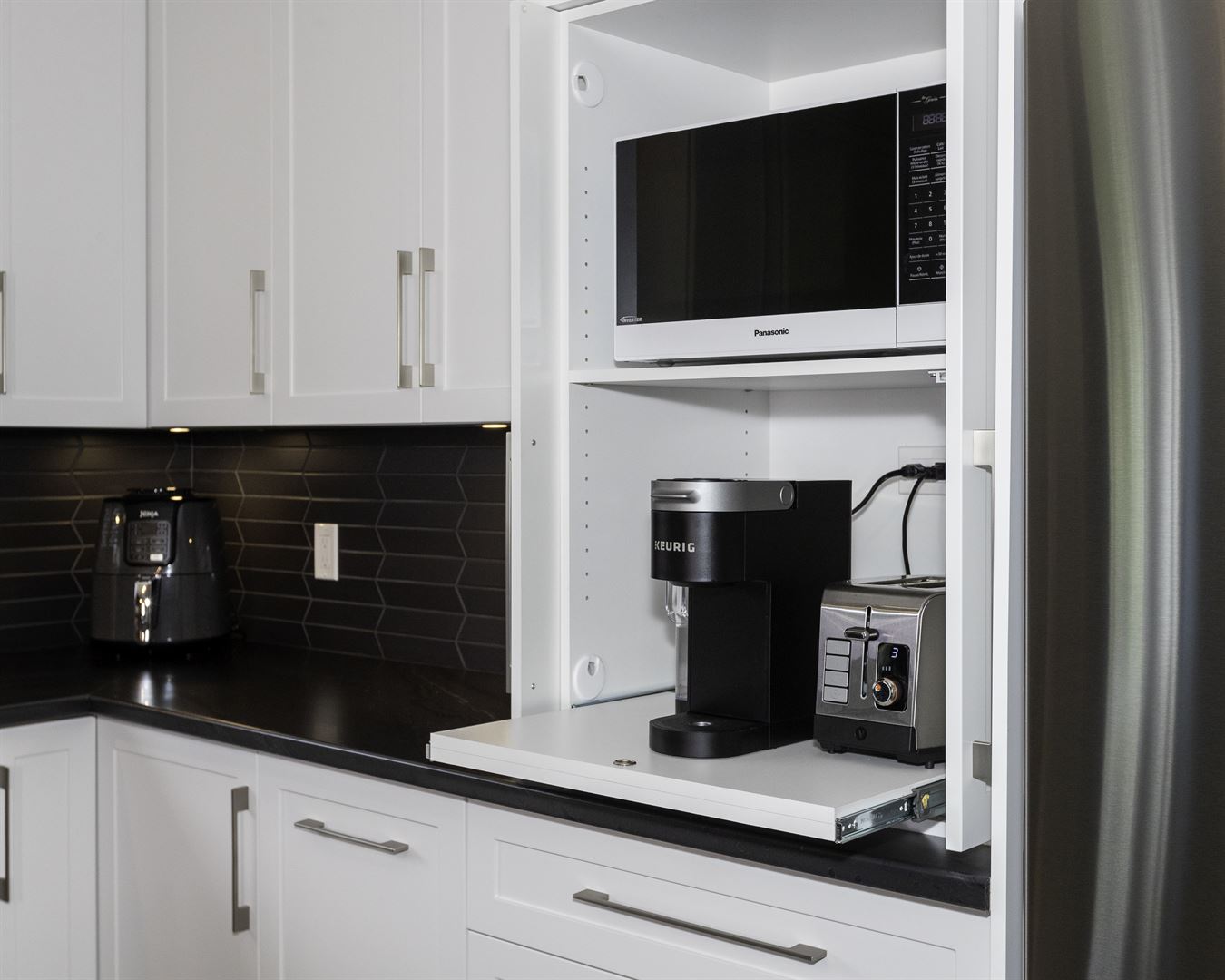 Îlot central avec place assise, dosseret moderne, toiles Hunter Douglas et agencement complet avec produits de notre boutique. Coin vanité et rangement laveuse-sécheuse séparé pour plus de confort. Une collaboration réussie avec un client impliqué a permis de respecter les échéanciers et d’obtenir un résultat harmonieux.