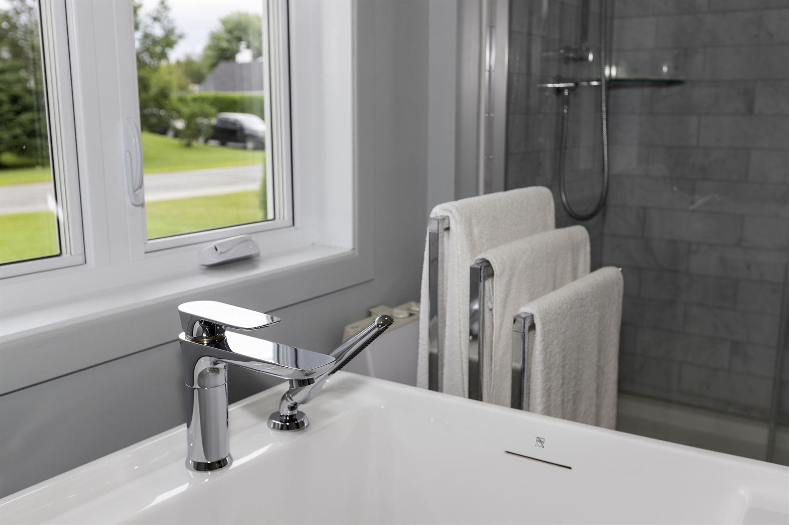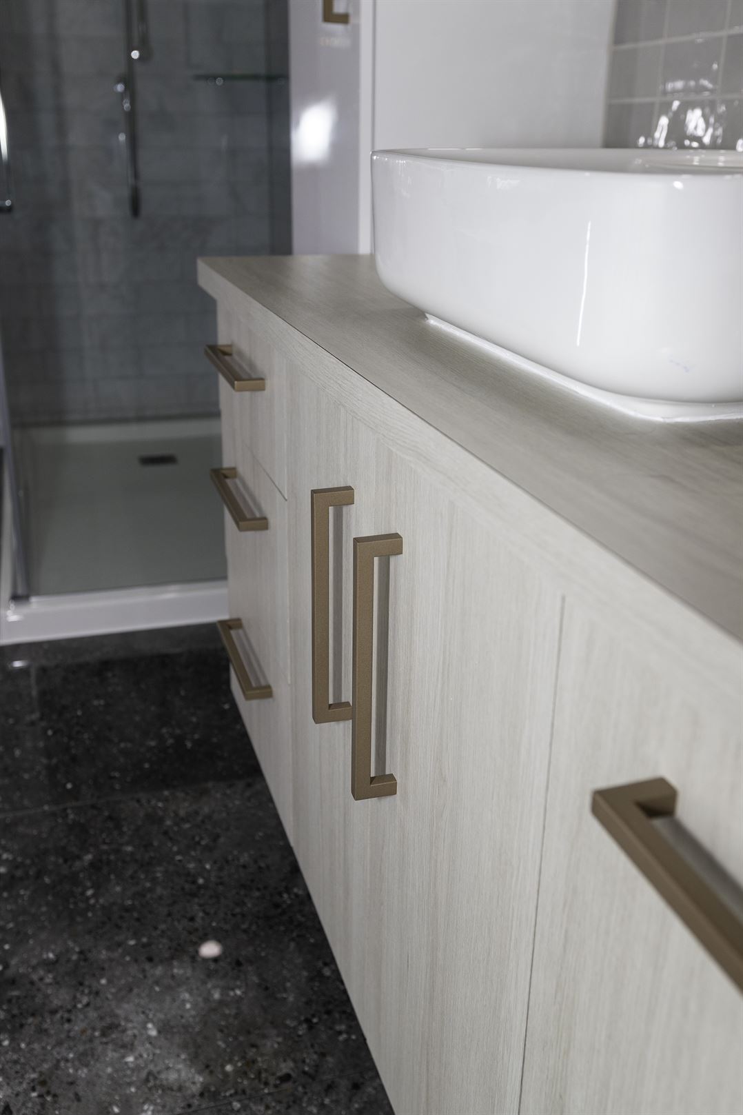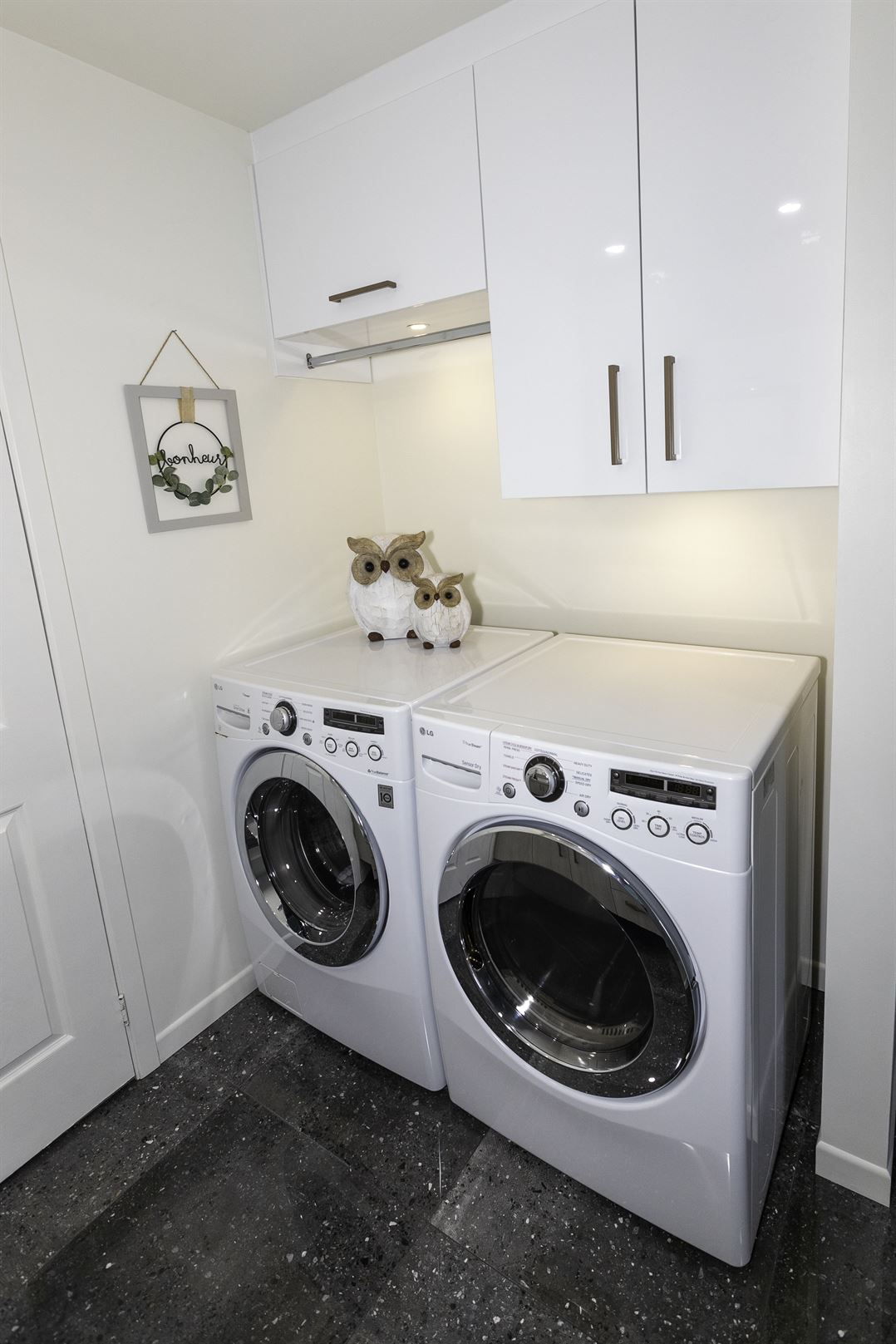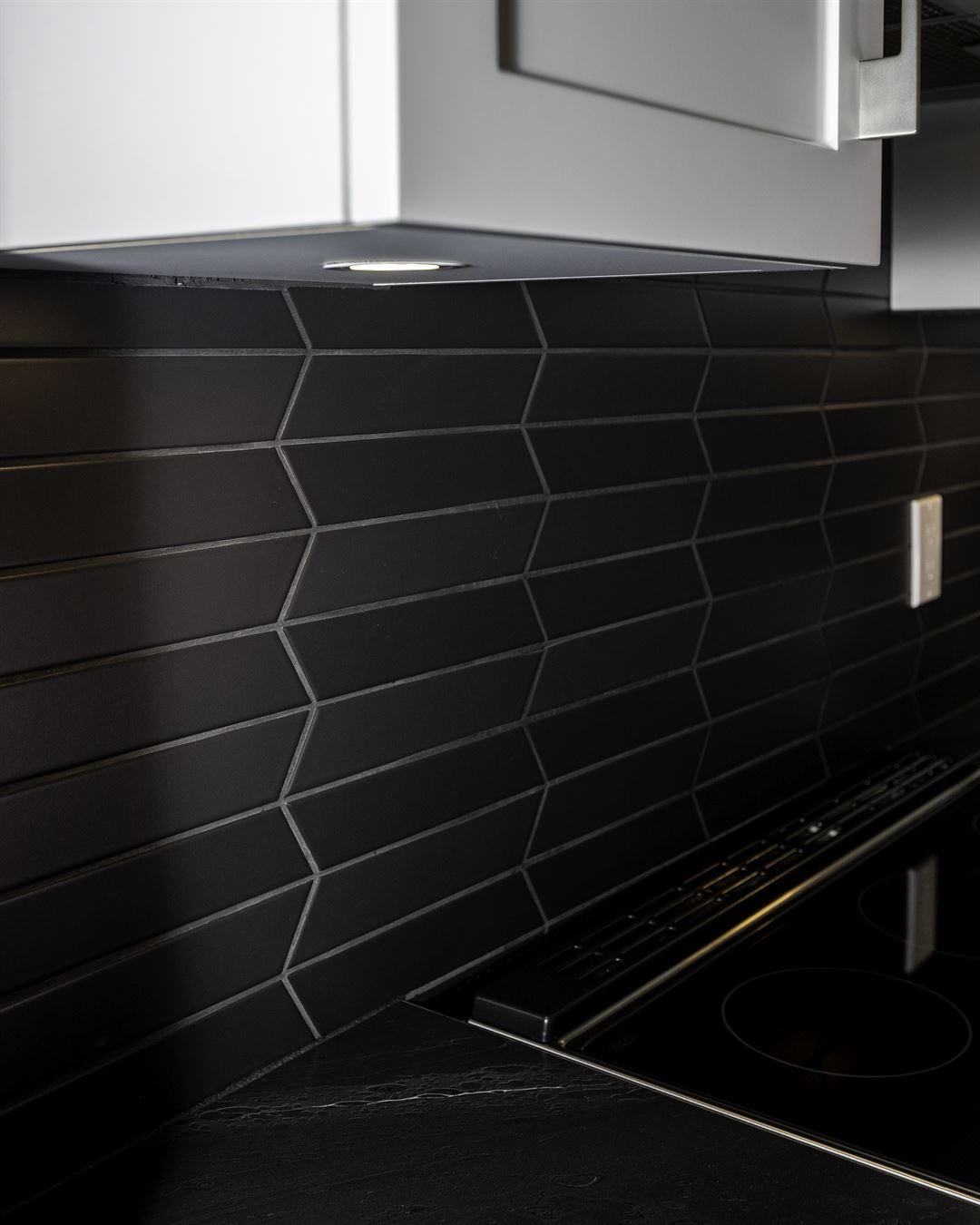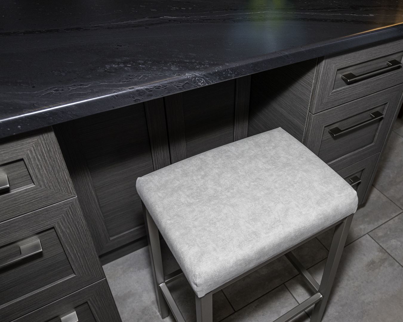 Îlot central avec place assise, dosseret moderne, toiles Hunter Douglas et agencement complet avec produits de notre boutique. Coin vanité et rangement laveuse-sécheuse séparé pour plus de confort. Une collaboration réussie avec un client impliqué a permis de respecter les échéanciers et d’obtenir un résultat harmonieux.