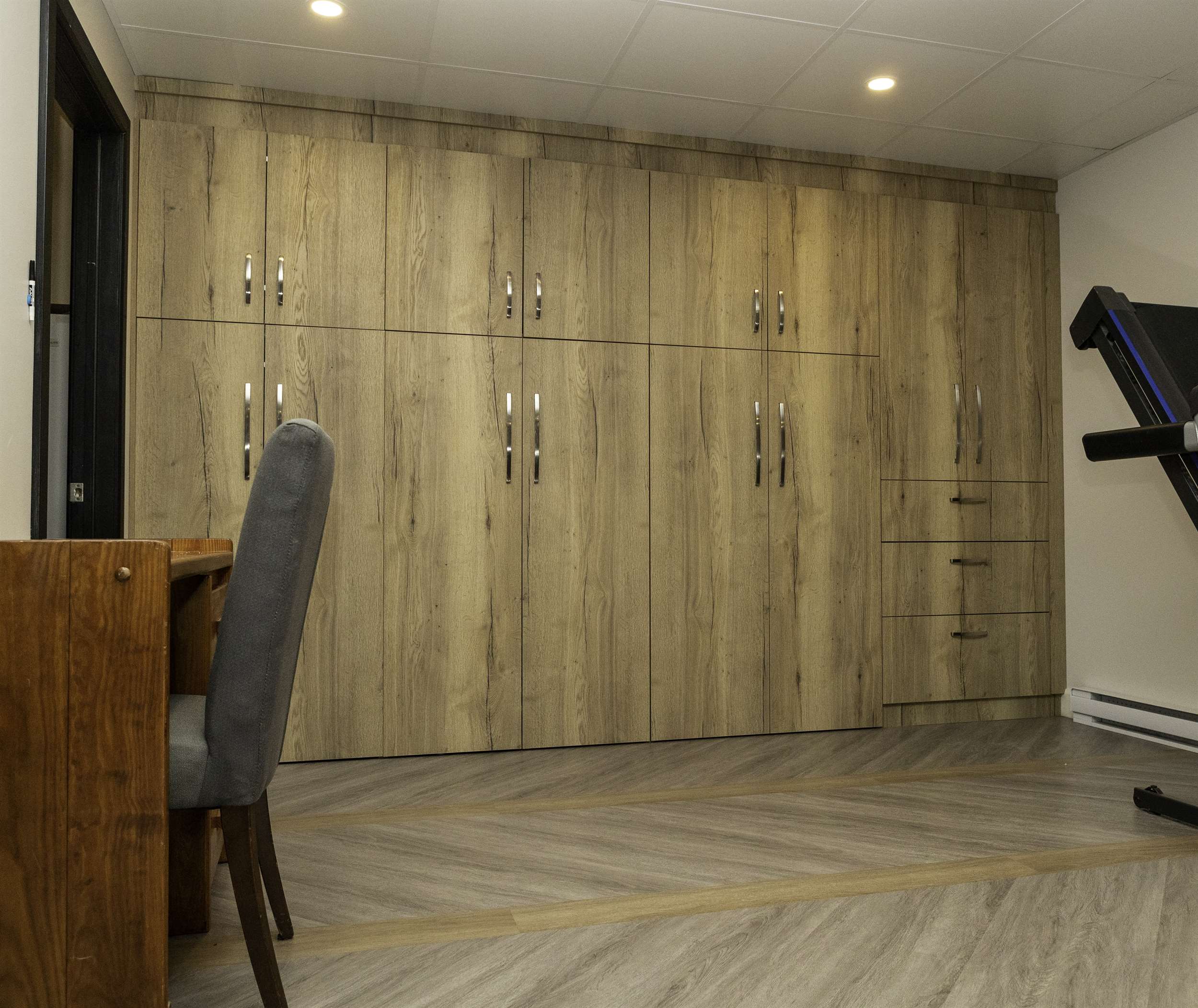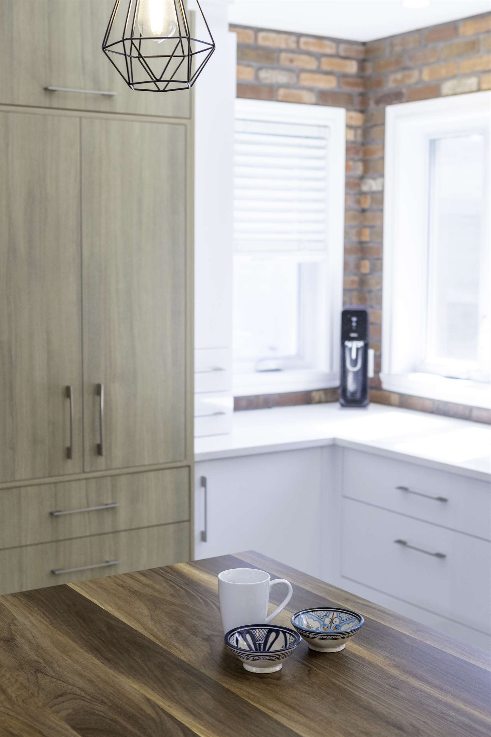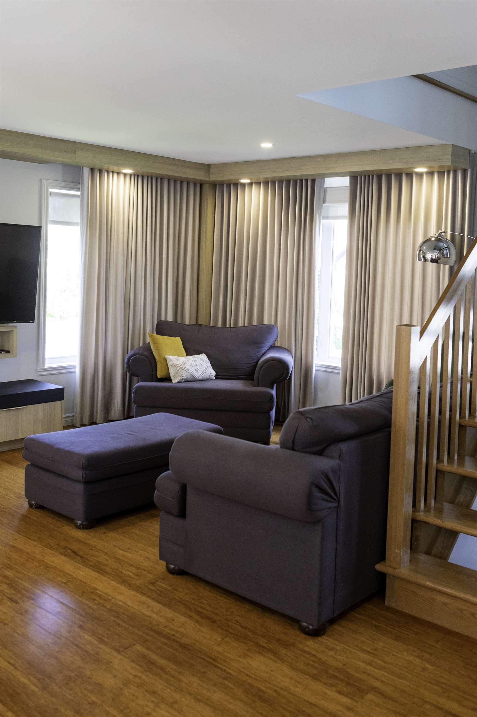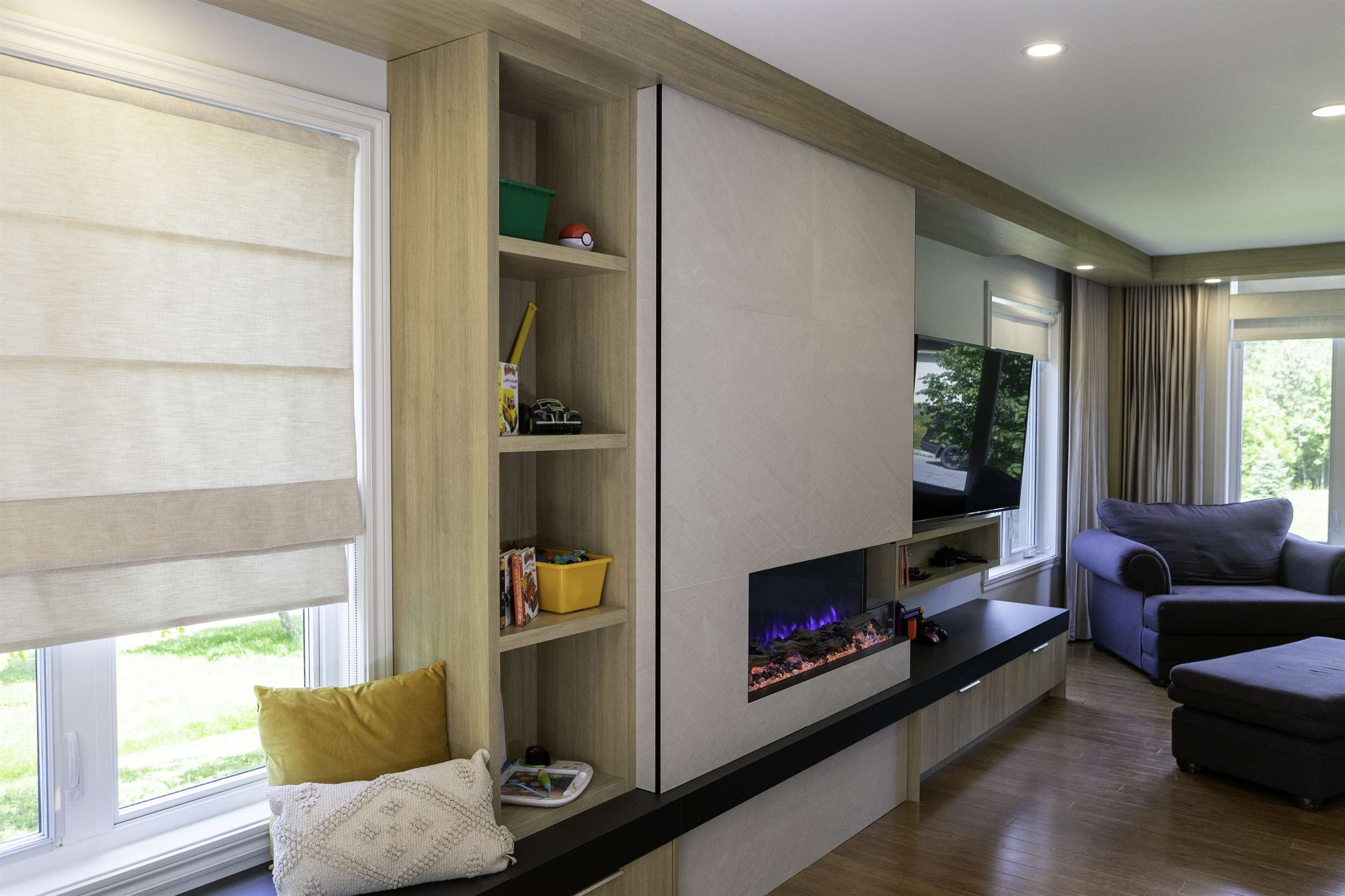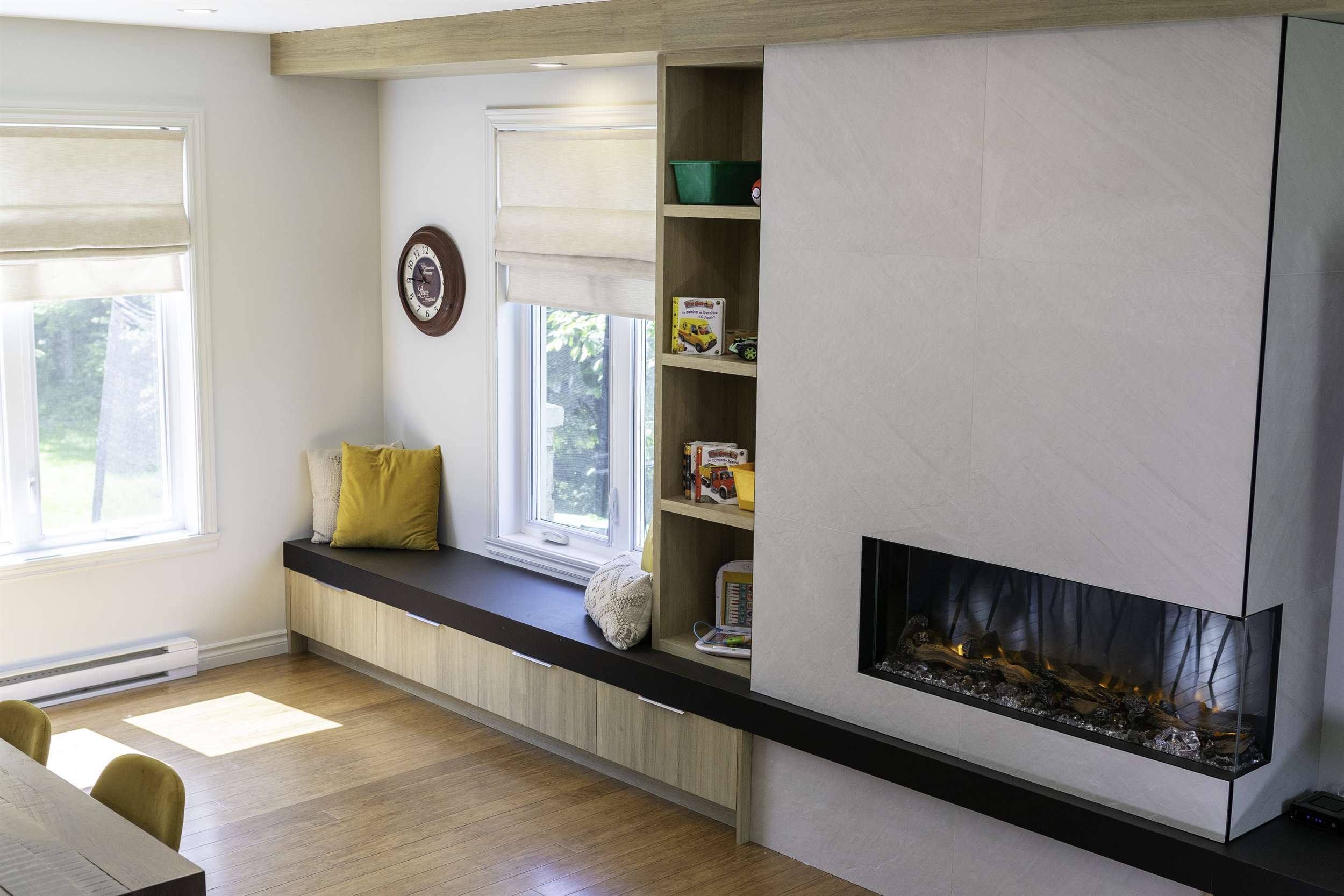 Dans ce projet, l’objectif était de créer des espaces plus fonctionnels et conviviaux pour une grande famille. L’entrée a été repensée avec du rangement pratique, la cuisine optimisée grâce à une quincaillerie de qualité et une meilleure ergonomie, tandis que le salon a gagné en chaleur avec un foyer, des rangements et des rideaux sur mesure. Chaque ajout a été soigneusement agencé à l’existant, avec des produits sélectionnés directement dans notre boutique.