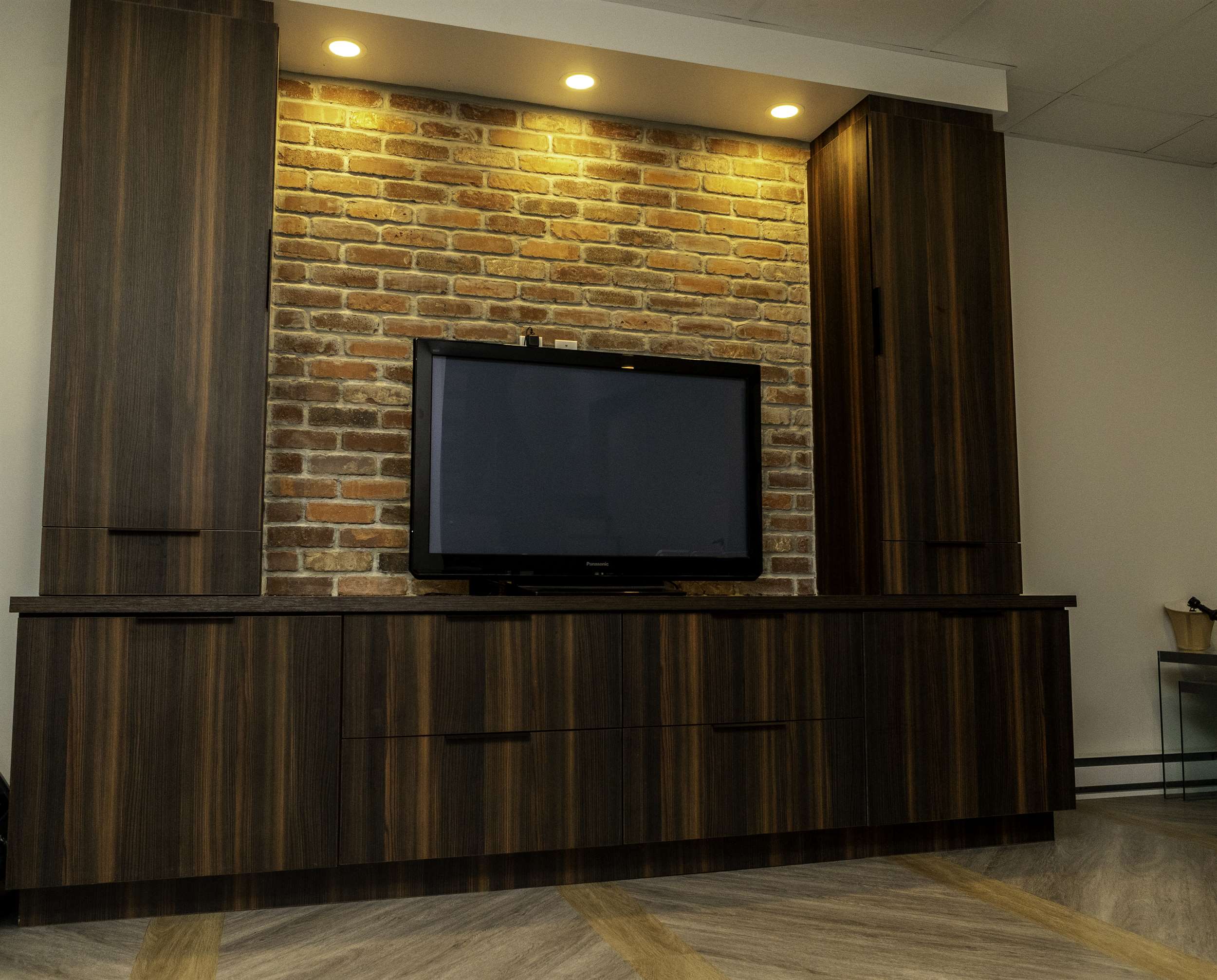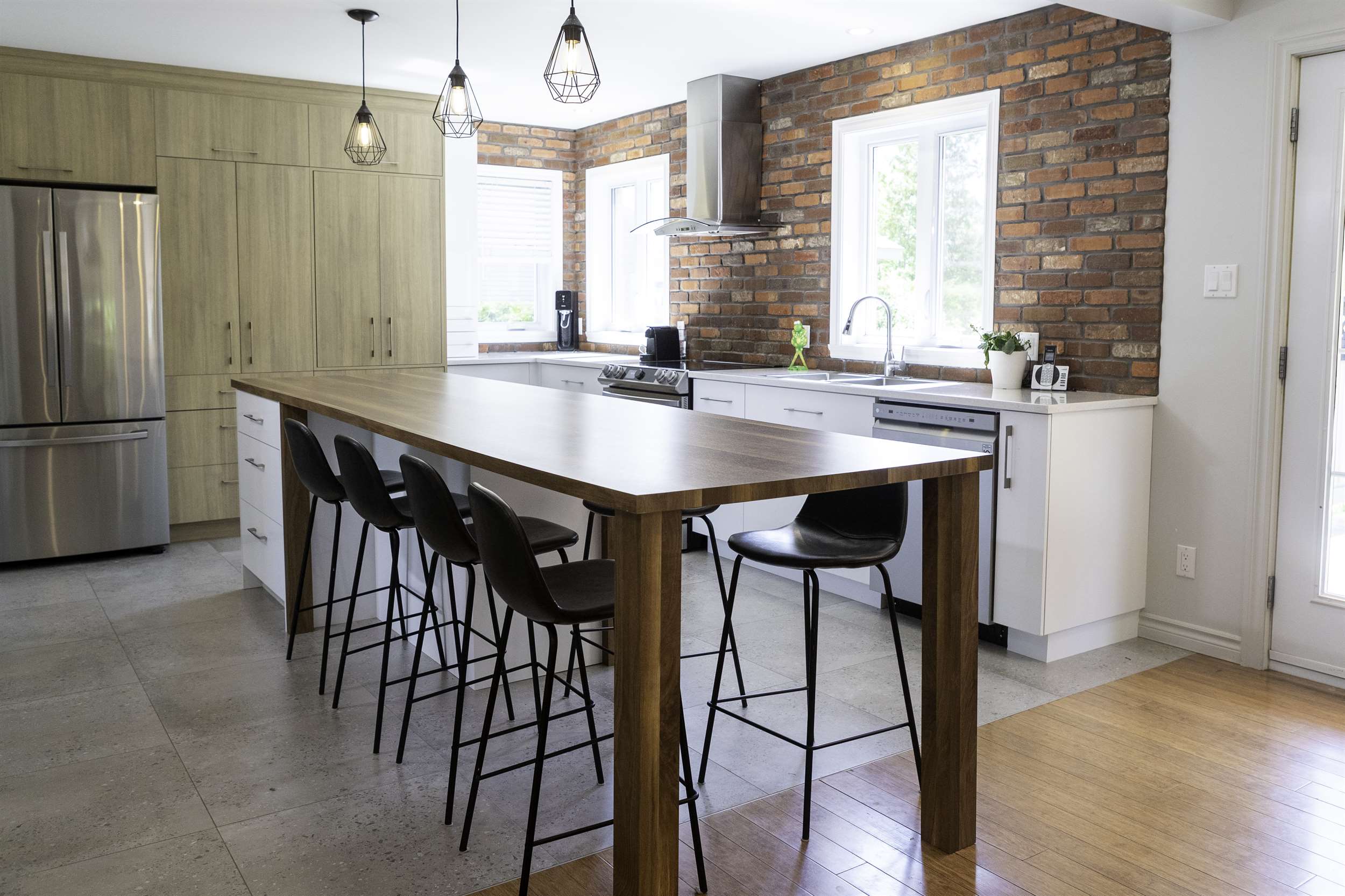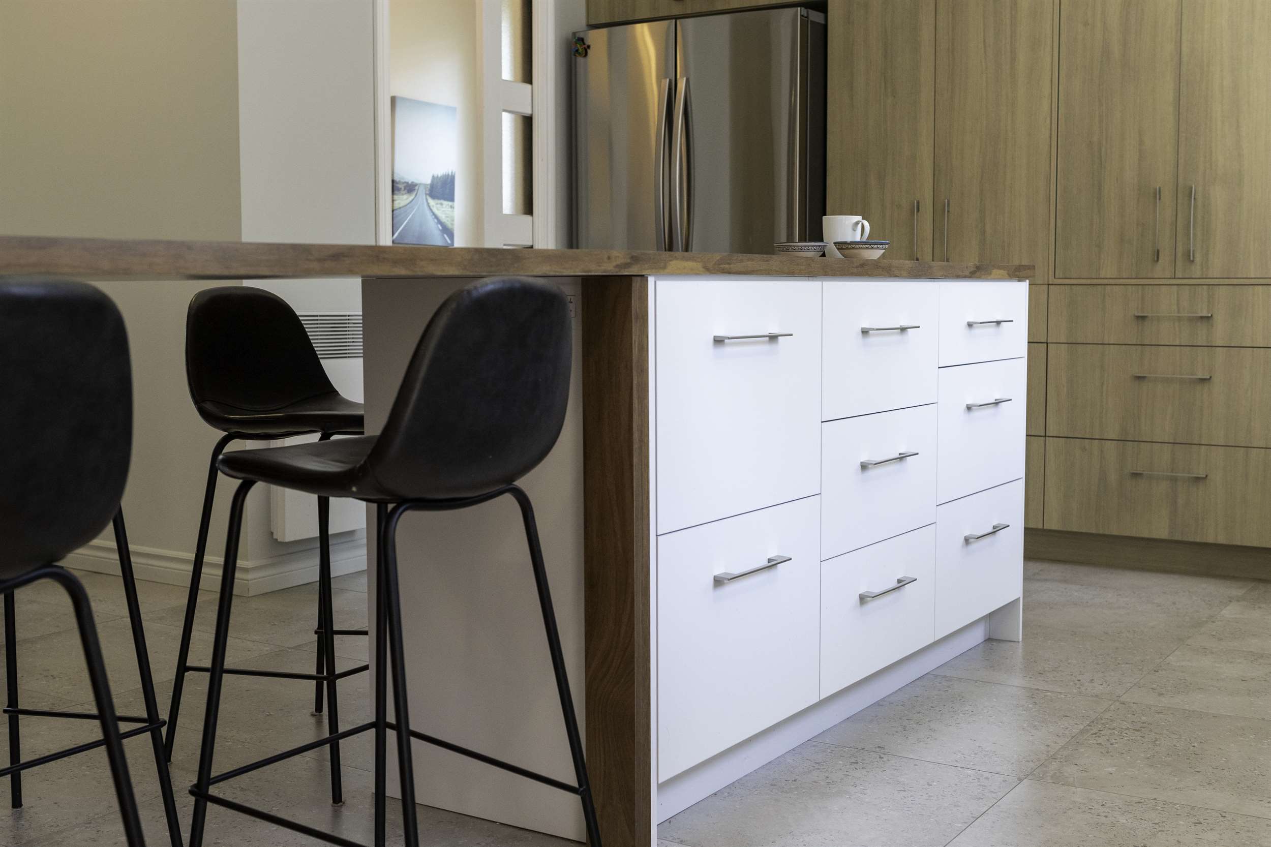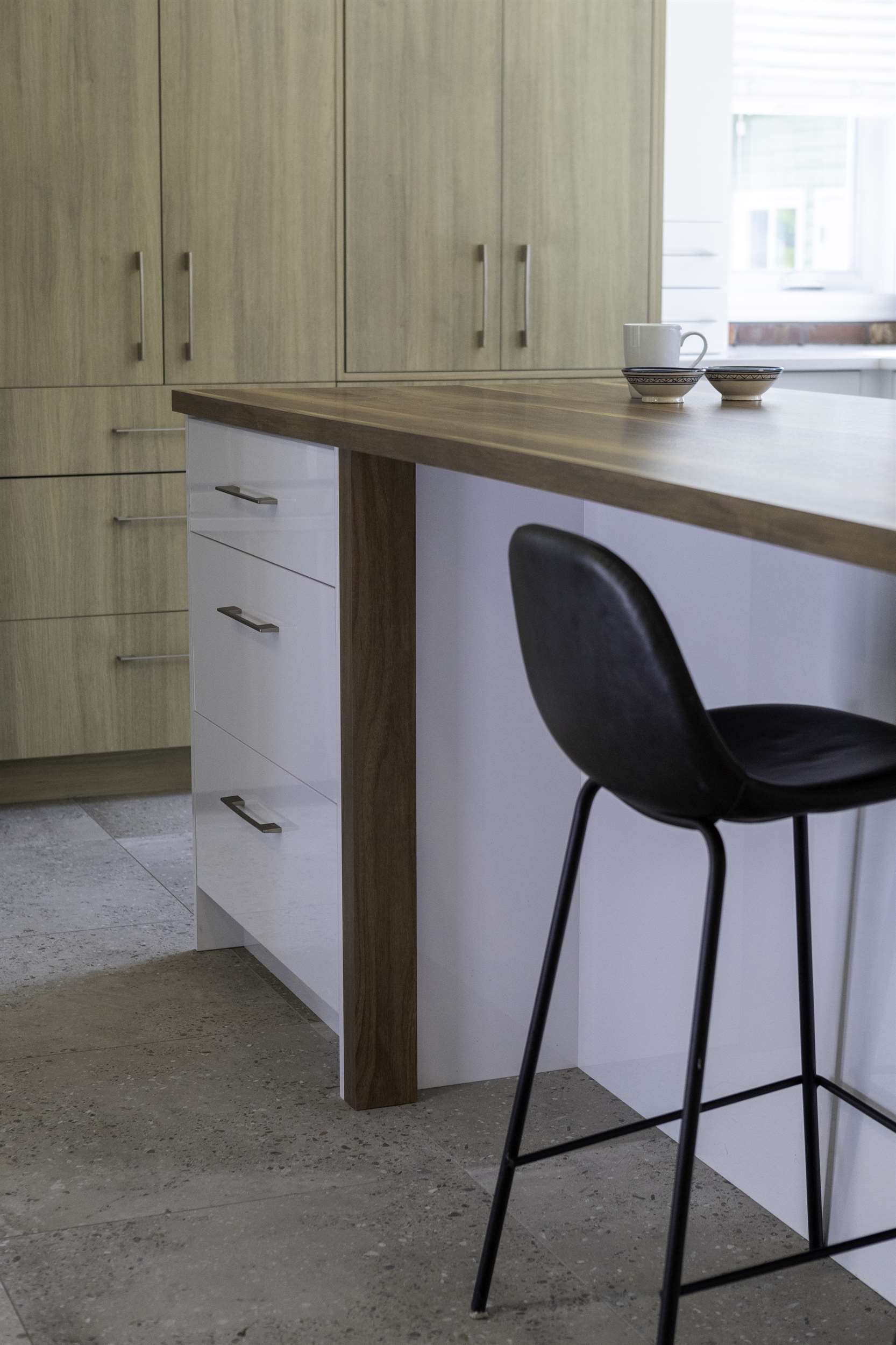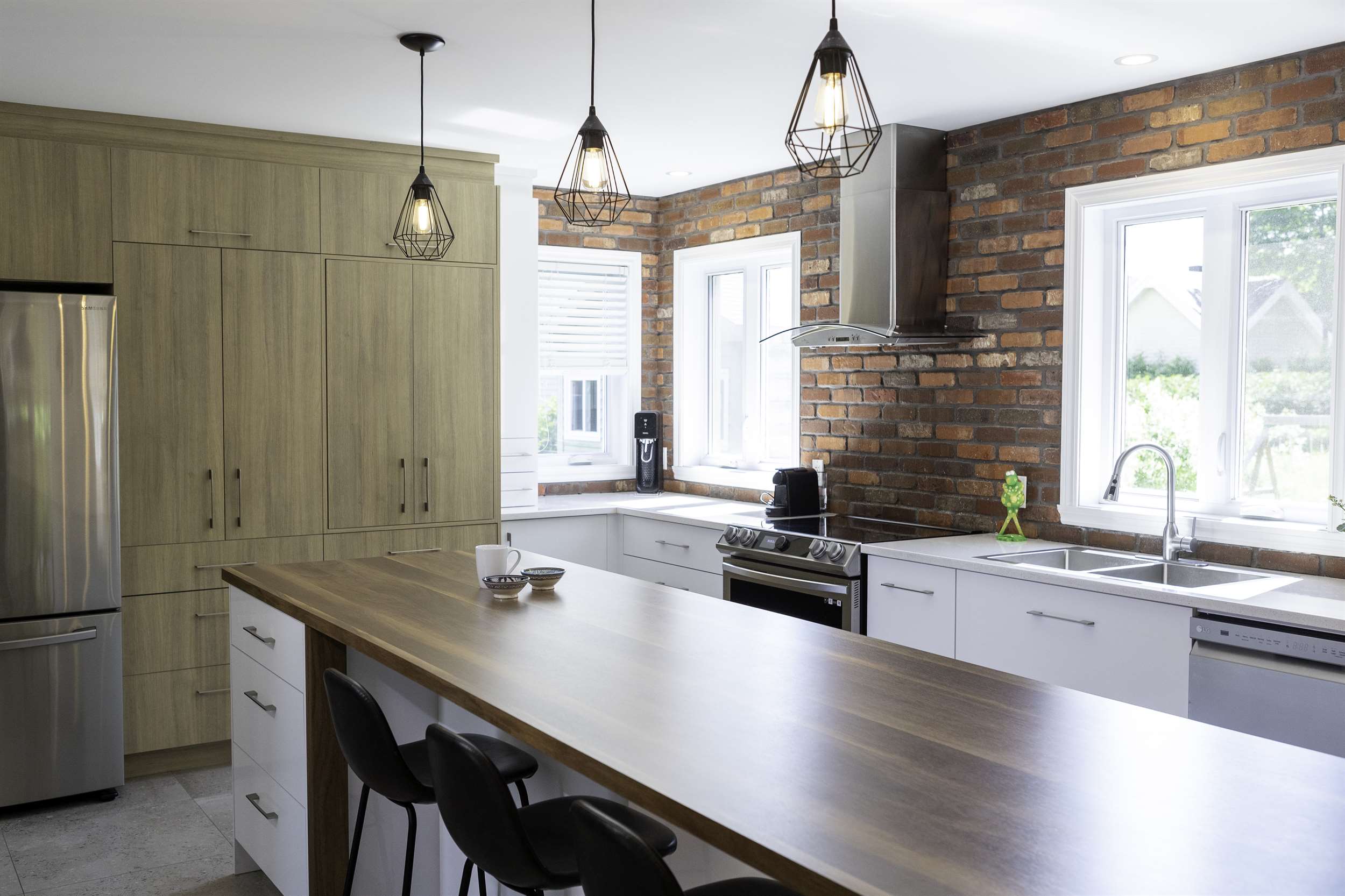 Dans ce projet, l’objectif était de créer des espaces plus fonctionnels et conviviaux pour une grande famille. L’entrée a été repensée avec du rangement pratique, la cuisine optimisée grâce à une quincaillerie de qualité et une meilleure ergonomie, tandis que le salon a gagné en chaleur avec un foyer, des rangements et des rideaux sur mesure. Chaque ajout a été soigneusement agencé à l’existant, avec des produits sélectionnés directement dans notre boutique.